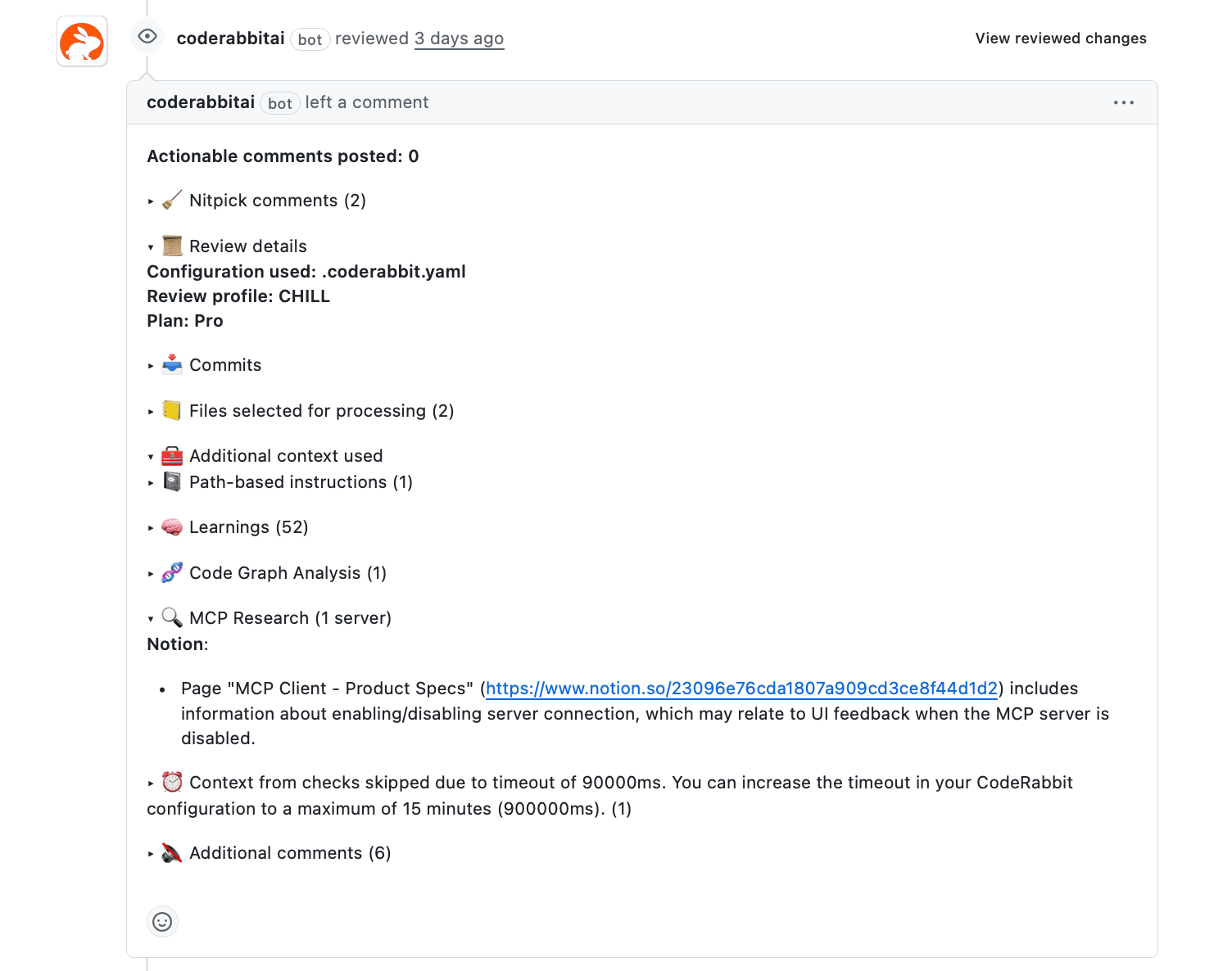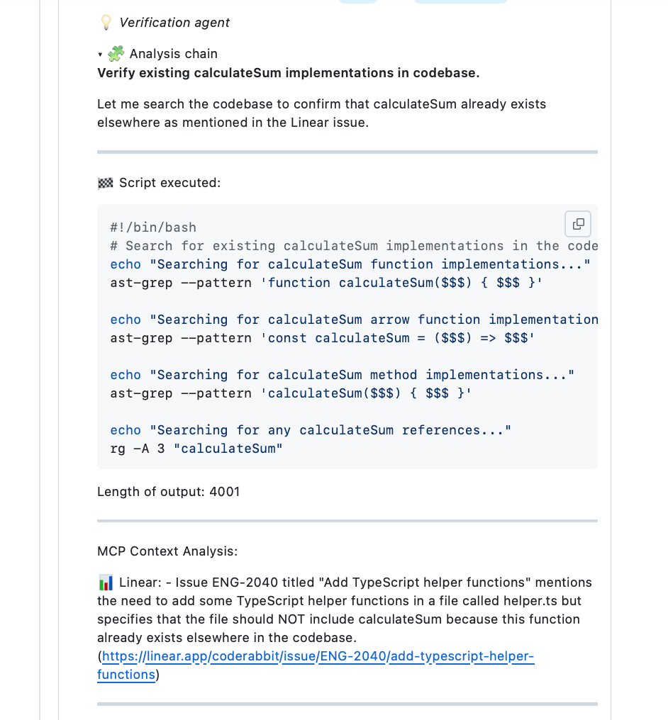 CodeRabbit searches connected MCP servers before starting a review. For example, database schema changes might get checked against data architecture documents. API endpoint implementations might get verified against service design patterns documented in internal wikis.