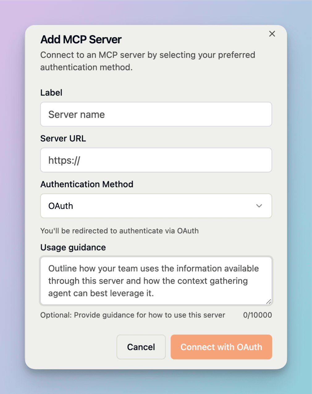 For MCP servers not on the list, enter the relevant credentials.