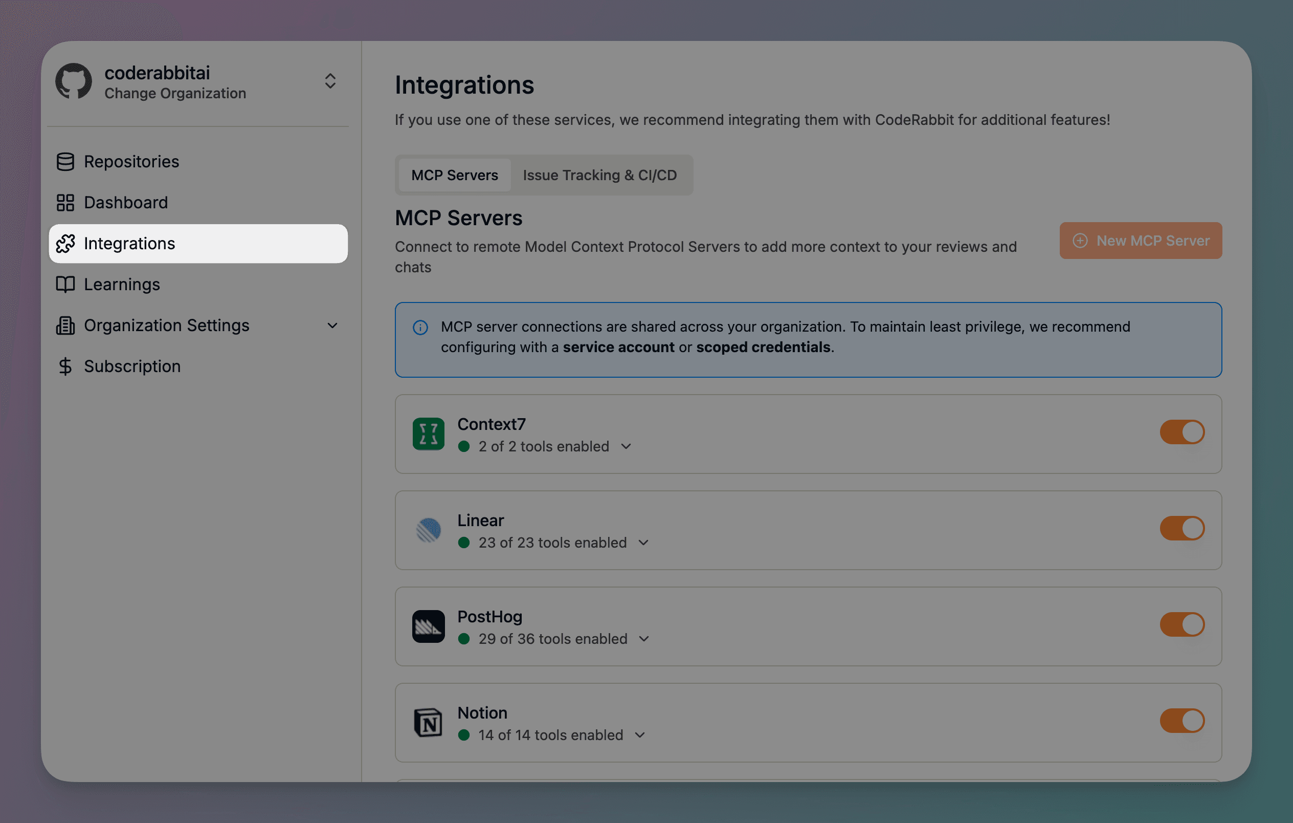 CodeRabbit works out of the box with 50+ integrations. With MCP, you can extend it to your custom servers and internal tools. Start with the systems you already use — Linear, Confluence, Datadog, Slack — and add more as you go.