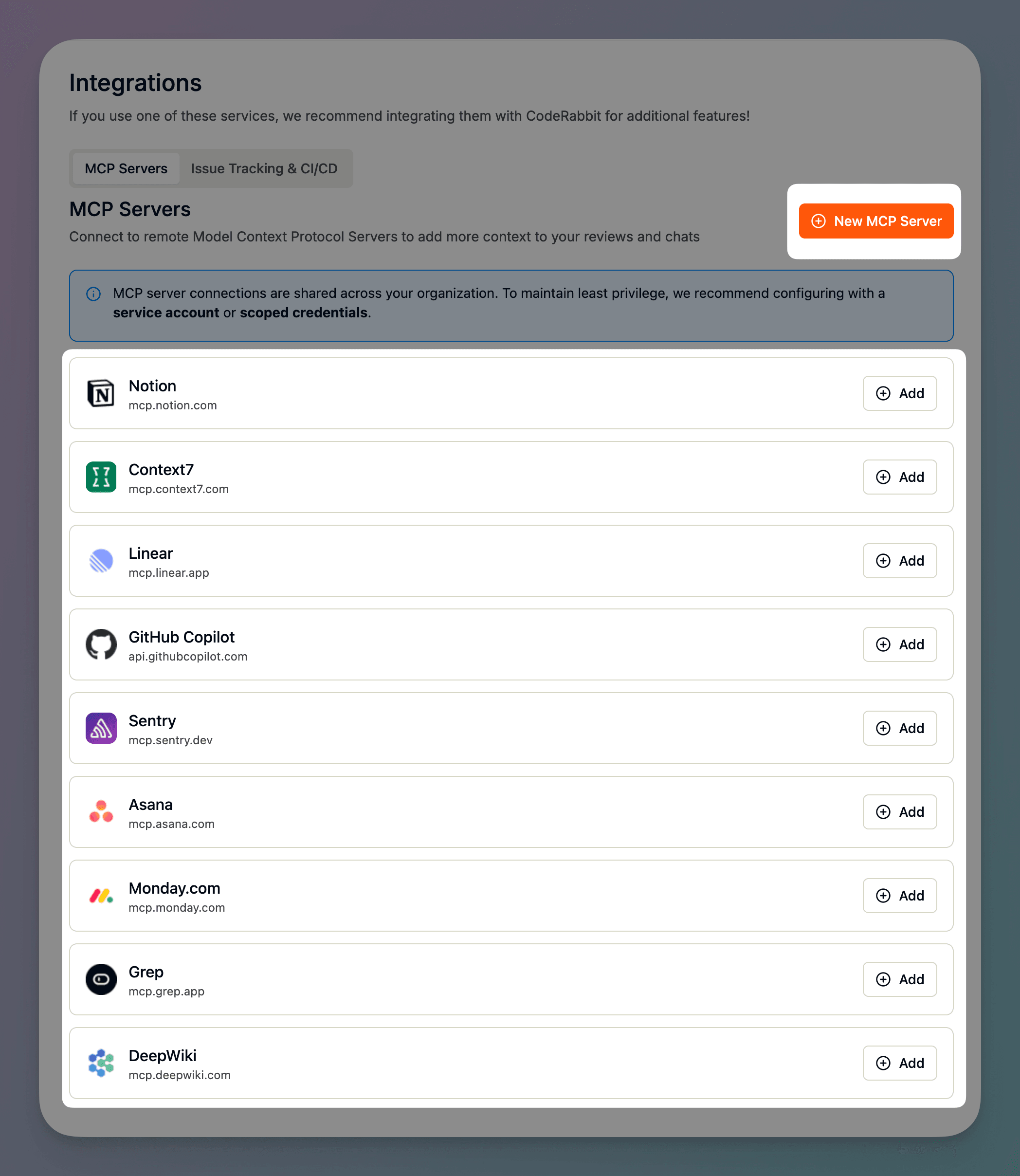 In the CodeRabbit dashboard, head over to integrations > and toggle to the MCP Servers tab if needed