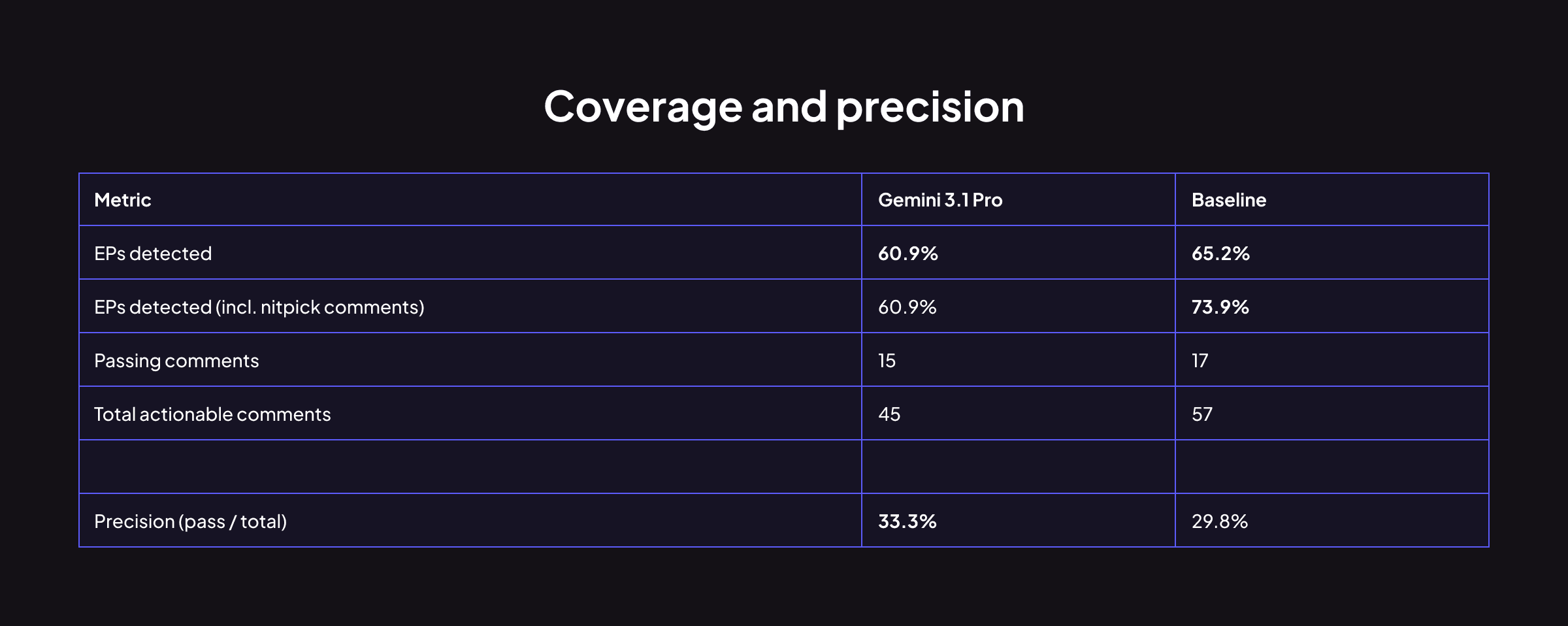 Gemini 3.1 Pro trails on coverage by 4.3 percentage points. It generates 24% fewer actionable comments while landing a slightly higher proportion of them on target (33.3% vs 29.8%). On raw coverage, Baseline has the edge.