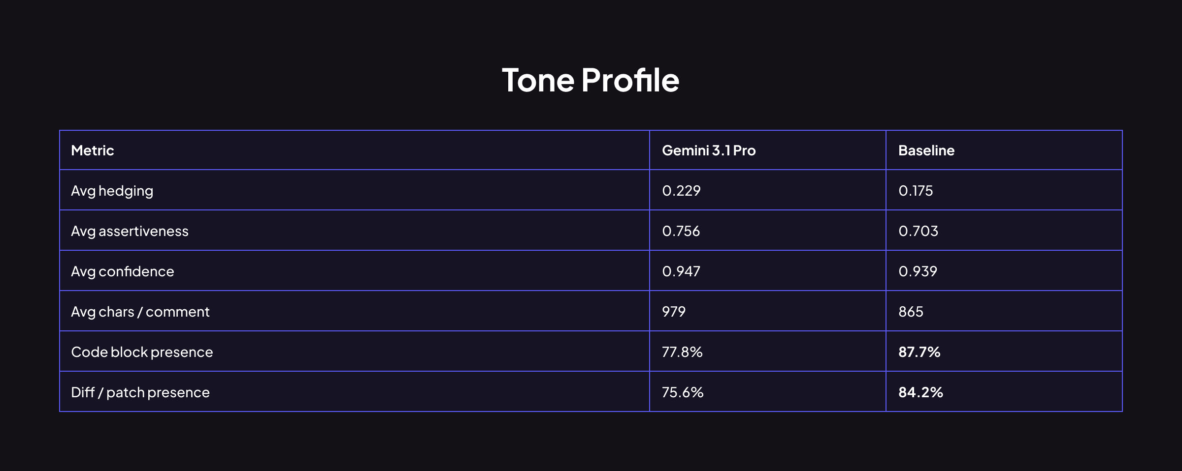 Gemini hedges more (0.229 vs 0.175) but is simultaneously more assertive (0.756 vs 0.703) and more confident (0.947 vs 0.939). This isn't contradictory; it reflects a style where Gemini softens its framing ("you might want to consider…") while its technical conclusions remain decisive. Its comments are longer on average but less likely to include code blocks or diff patches compared to Baseline.
