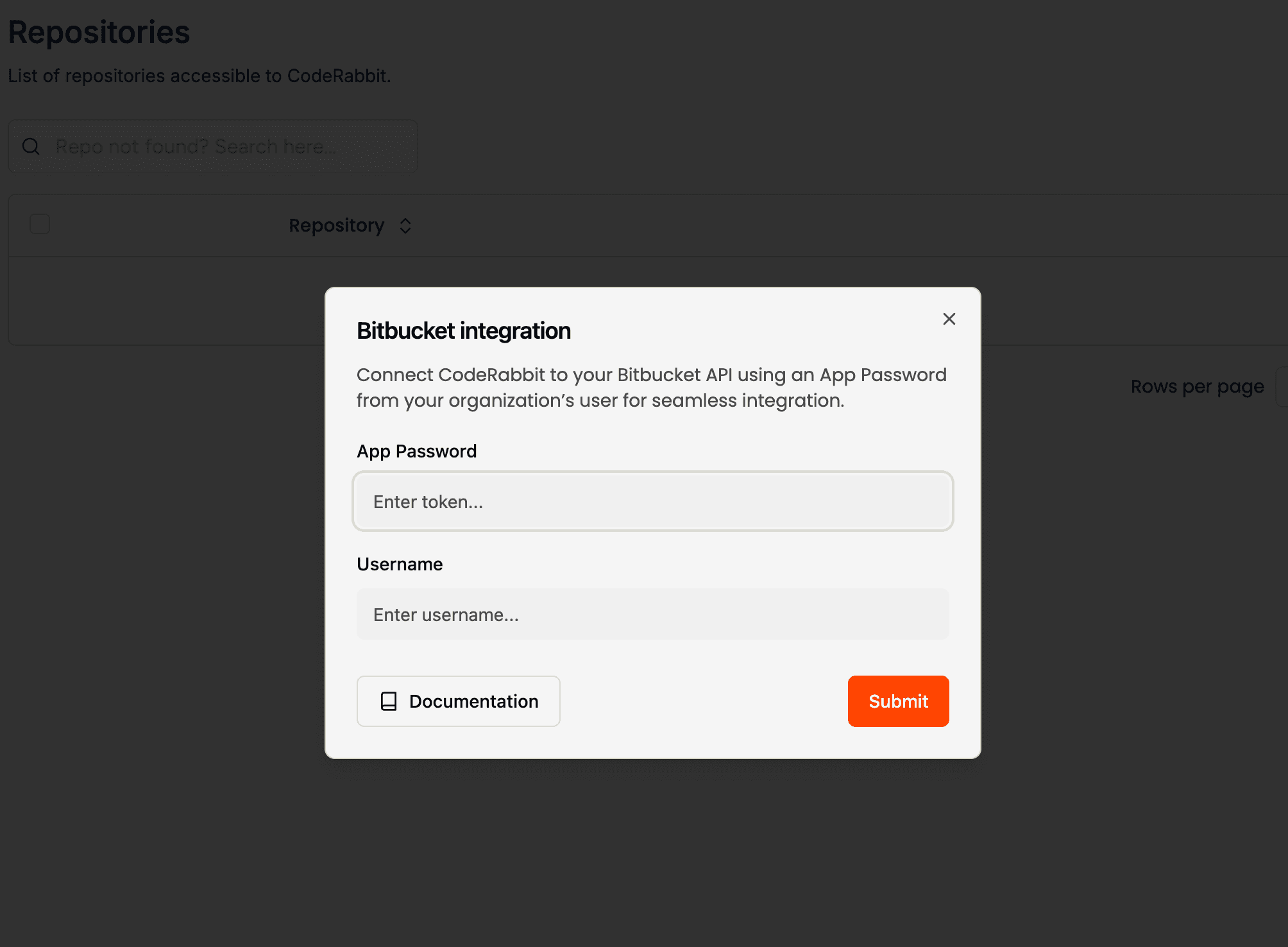 Generate an App Password to enable integration between CodeRabbit and your Bitbucket repositories. Enter the App Passport in the CodeRabbit UI. This will automatically configure the required webhook for seamless integration.