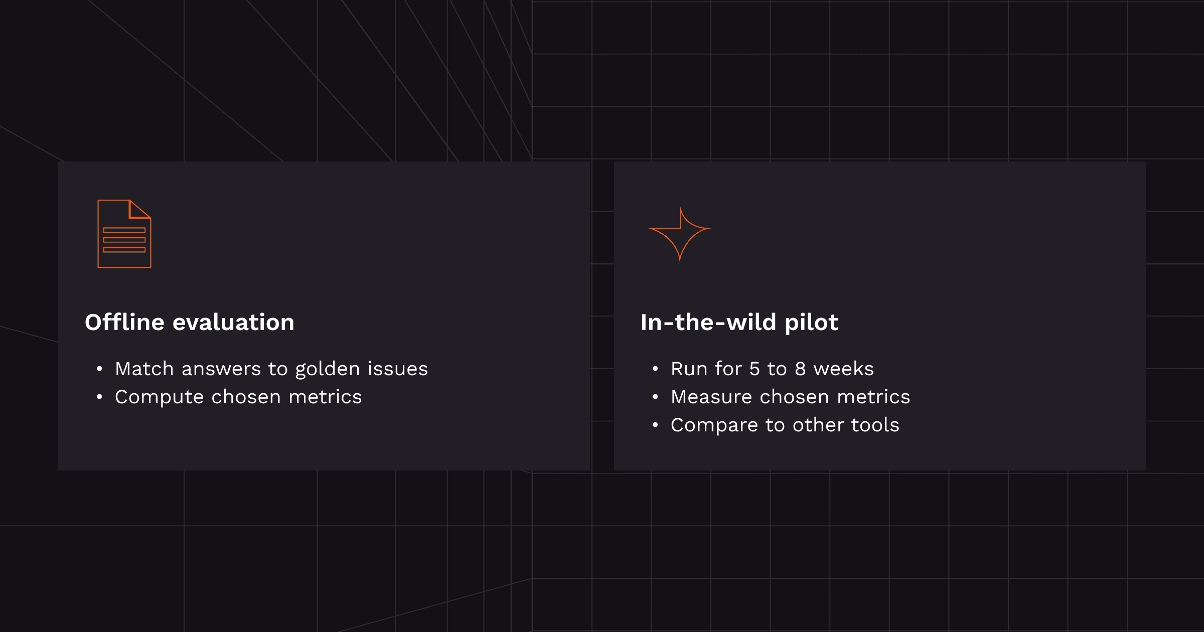 その後、ゴールデンイシューと、公開されたプロンプトや閾値を持つLLMマッチャー、またはファイル/行+意味チェックによるルールベースマッチングを使います。