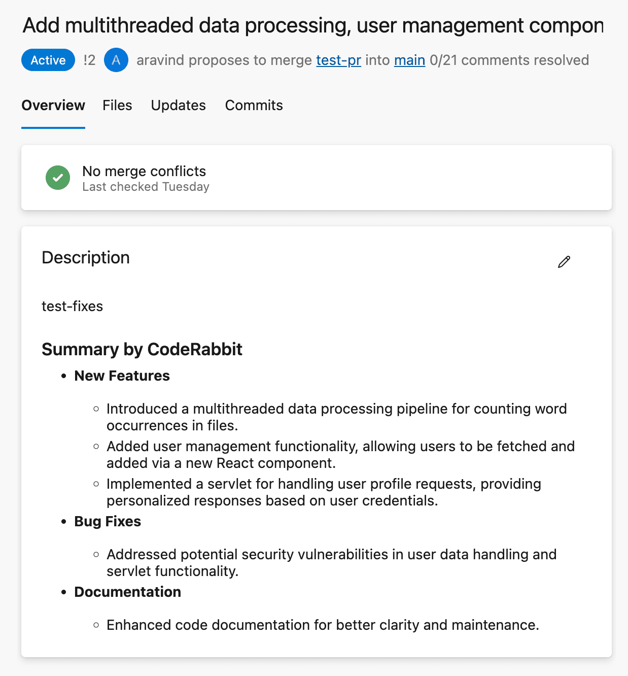 Early issue detection: CodeRabbit performs a thorough, line-by-line review of your code changes within Azure DevOps organization, ensuring that no potential issues slip through the cracks. By identifying and addressing issues at the earliest possible stage, CodeRabbit helps maintain a high-quality codebase and prevents tech debt accumulation.