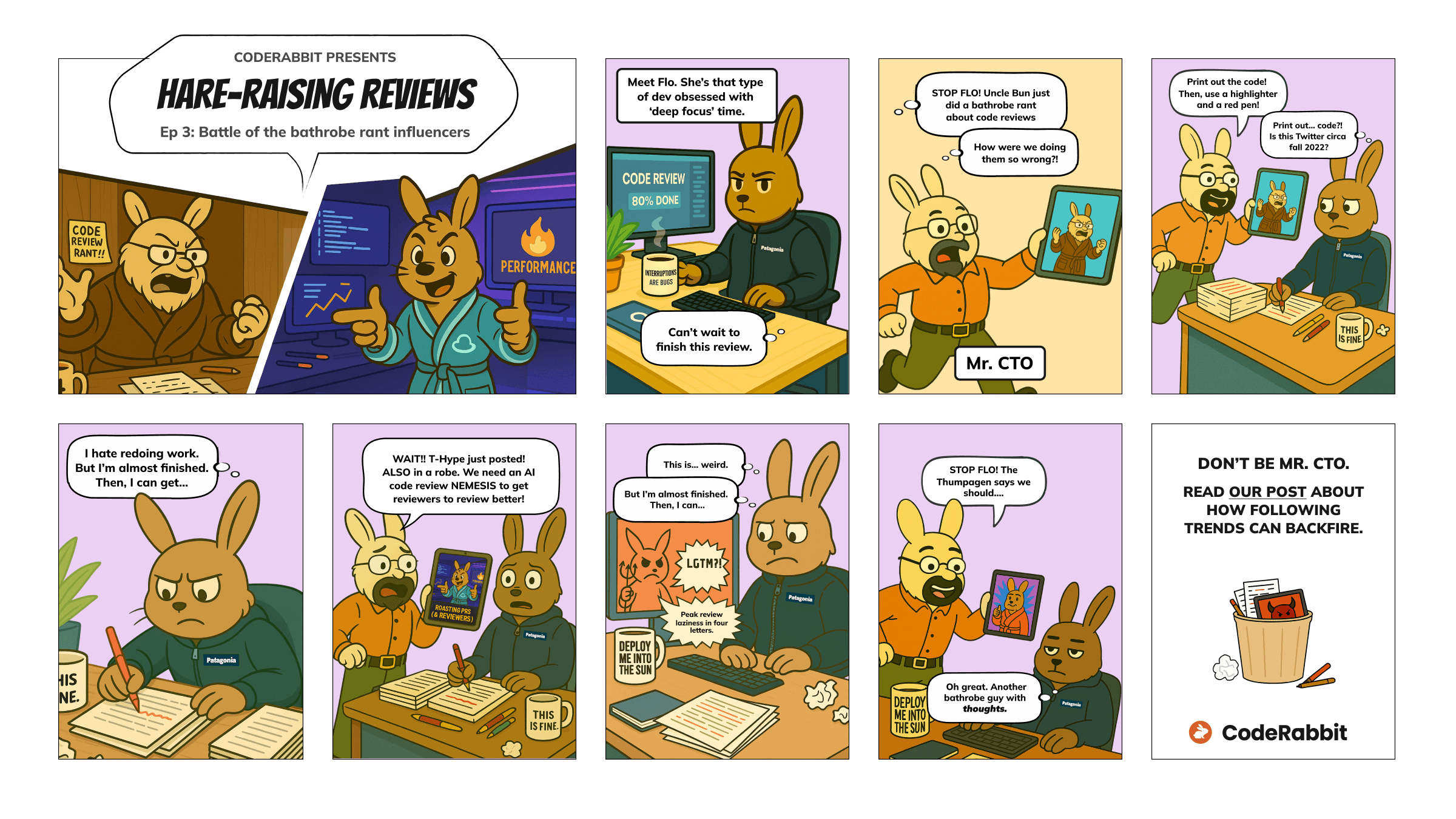 To illustrate the impact of influencers on development cycles, we created a comic. The Battle of the Bathrobe Influencers playfully pokes fun at some of our favorite influencers and how many different code review takes there are on the timeline right now and how that might affect individual developers if teams actually listened to and followed all the competing takes. No influencers were harmed in the making of this comic⊠we hope.