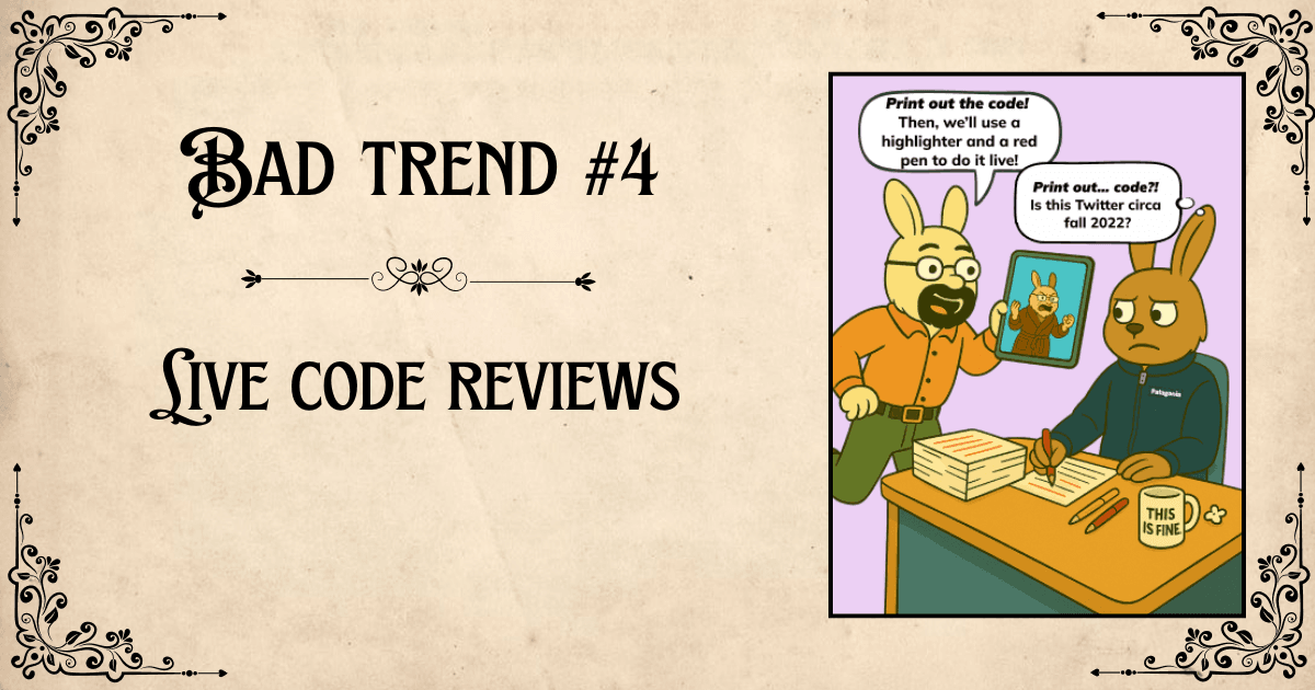 Live code reviews are the latest workplace horror disguised as collaboration and âcontext sharing.â And sometimes they are! But often theyâre just a weird hybrid of interrogation and performance art. You sit there while someone scrolls through your functions like theyâre auctioning off your dignity and other devs chime in with helpful thoughts like, âYeah, I had questions about that, too.â