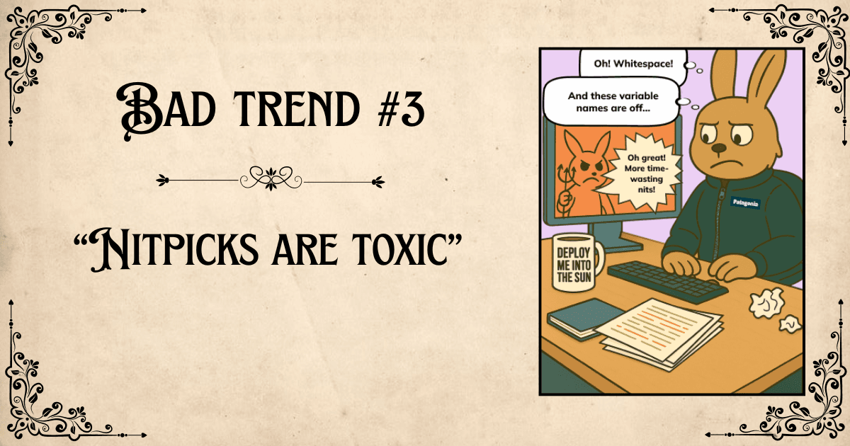 Thereâs a growing movement online that says nitpicky comments in code reviews are basically microaggressions. That if you suggest someone rename a variable or break up a 30-line function, youâre stifling creativity and slowing down development for no good reason. Look, we get it. No one wants to receive 14 comments about whitespace and whether itâs âutilsâ or âhelpers.â But not all nitpicks are created equal.