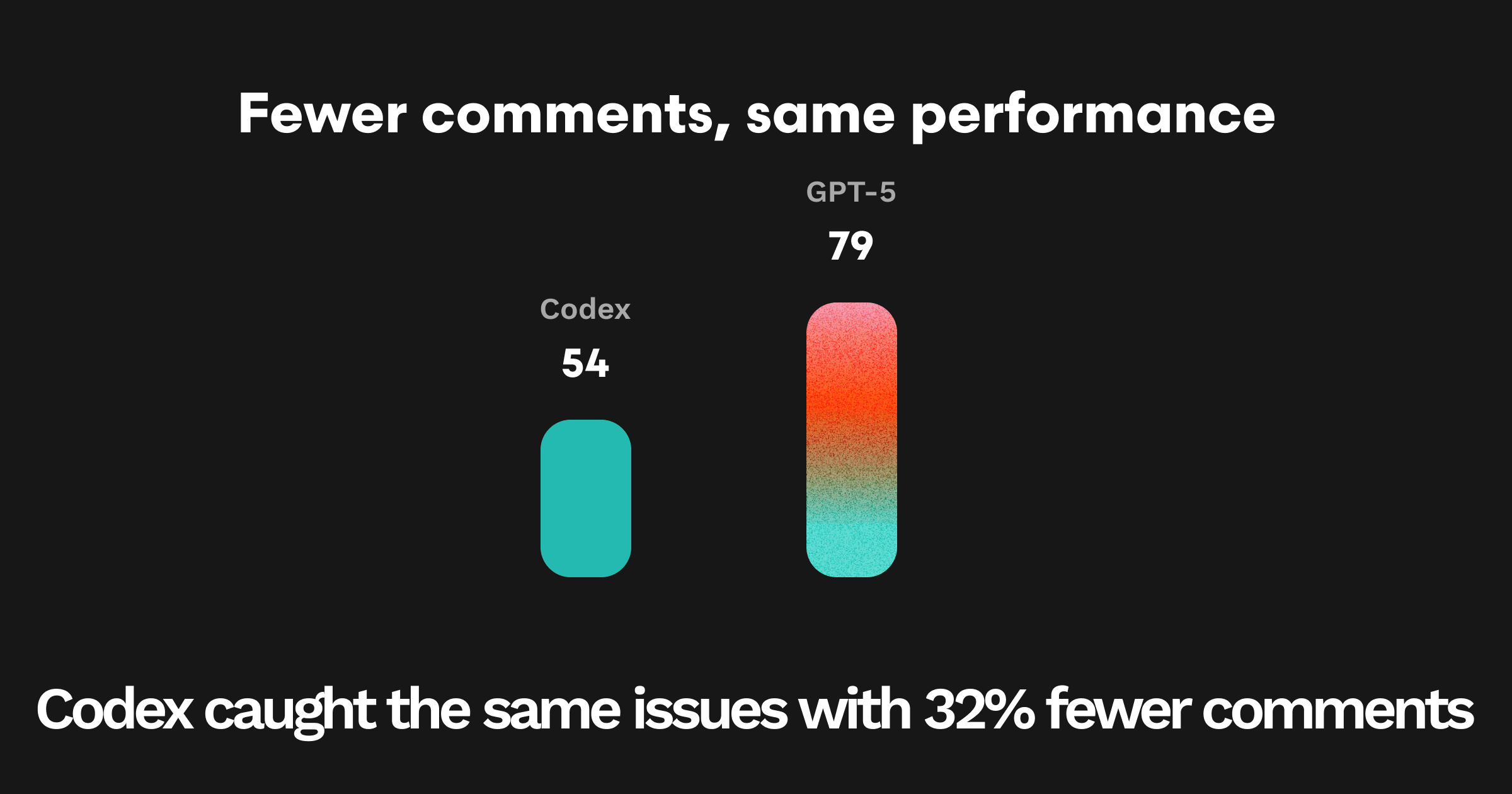 CodexはGPT-5のバグ発見力を維持したまま、コメント量を約32%削減(54 対 79)し、コメントあたり精度を約35%向上(46.3% 対 34.2%)。ClaudeはカバレッジはGPT-5に近いものの、より冗長で精度は低めでした。