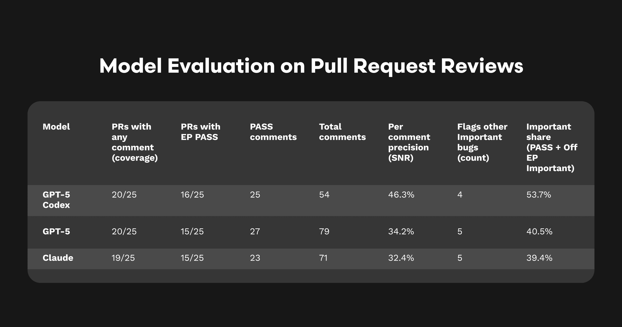 意味するところ: Codexは25本中20本のPRをカバー(残り5本は未カバーのFAIL)。総コメント数は少ないにもかかわらず、EPのPASS数はやや上回り(16 対 15)、重要(Important)コメントは大幅に増加。コメントの半分以上が、そのPRで想定していた問題へのダイレクト、または別の重大バグの指摘でした。GPT-5とClaudeは精度・重要比率ともに約40%で、後塵を拝しました。