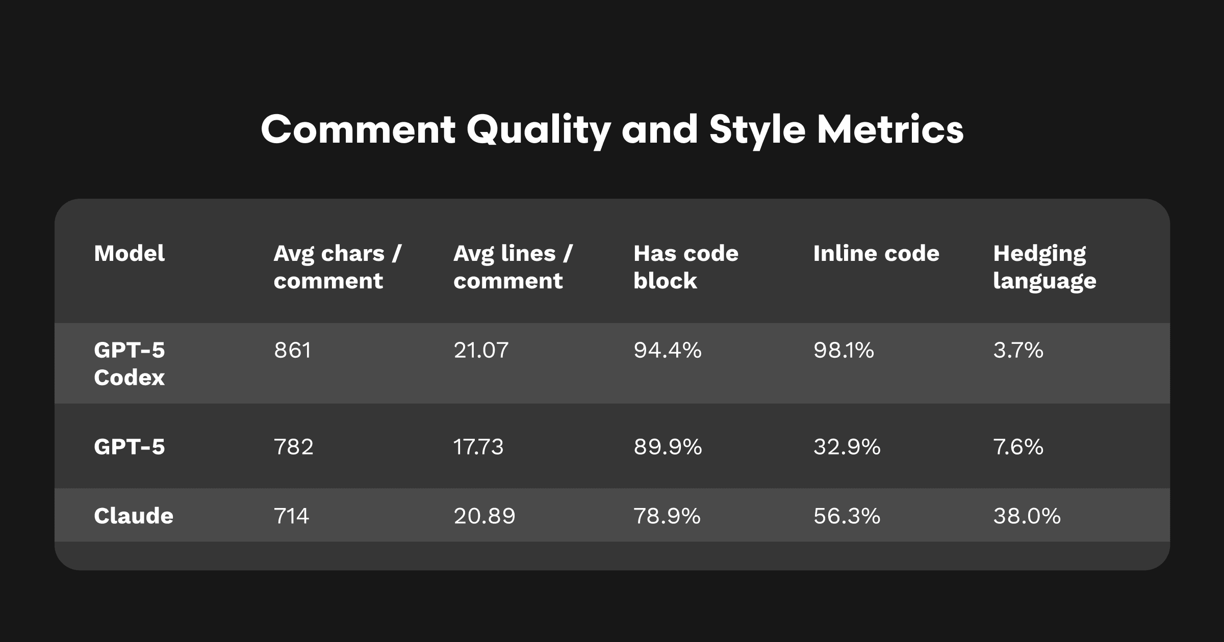 スタイル: Codexは94%のコメントでdiffを含み、このセットではClaudeやGPT-5より曖昧表現が少ない。