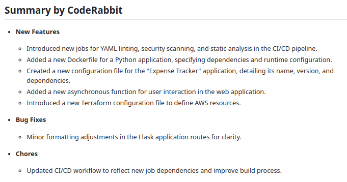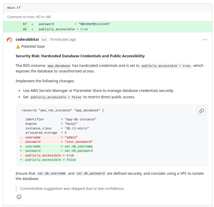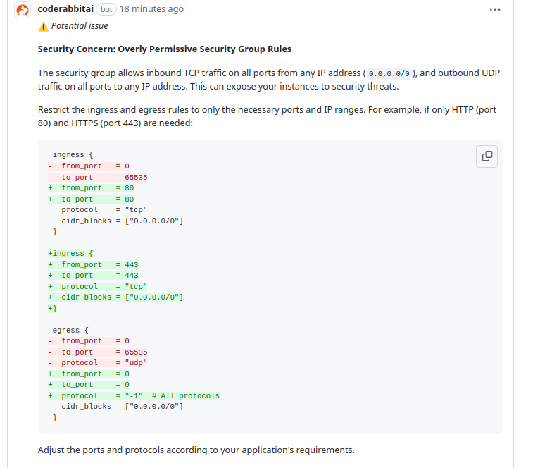 Integrating security checks into the CI/CD pipeline ensures vulnerabilities and errors are caught early in development, leading to more stable software releases. Automated scans for secret detection and IaC misconfigurations reduce reliance on manual reviews. As seen, CodeRabbit flagged overly permissive security group rules, enabling prompt issue resolution.