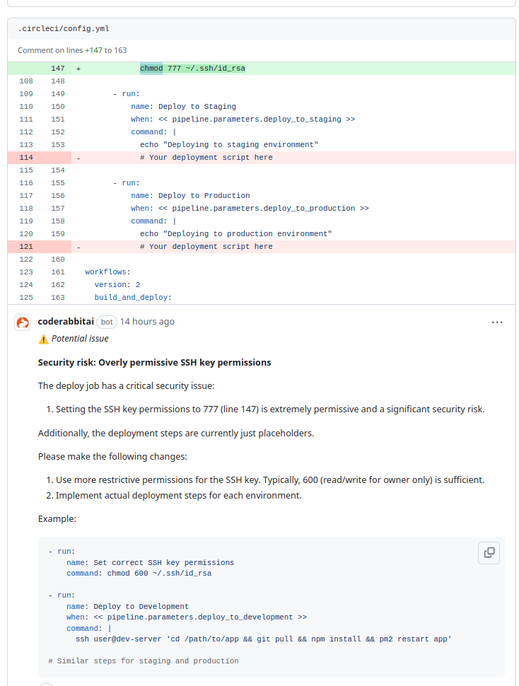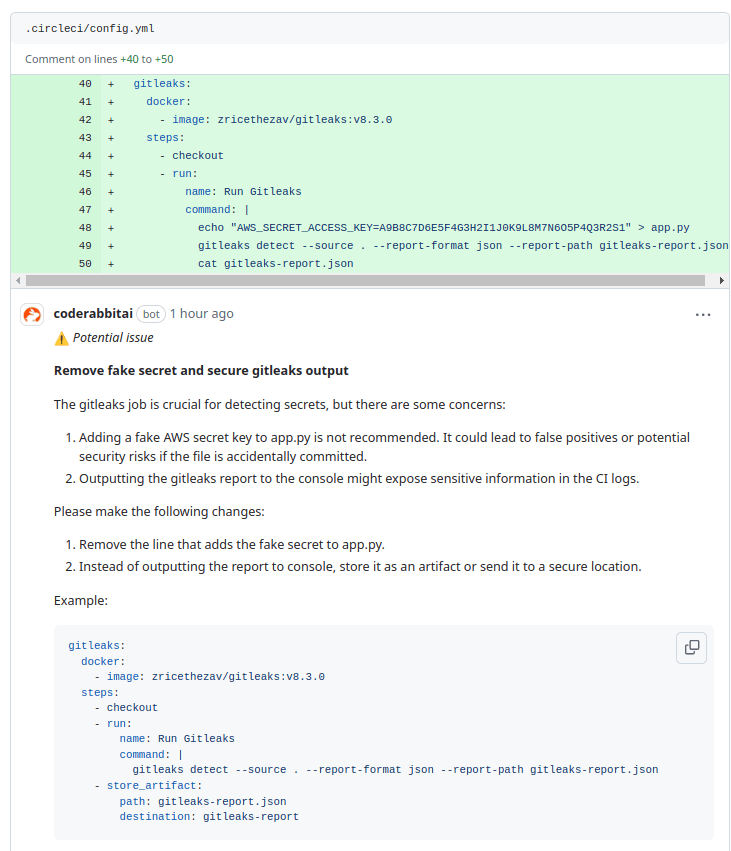 To demonstrate the functionality of CodeRabbit in detecting secrets and security issues, we voluntarily introduced issues in our CircleCI setup, such as incorrect configurations, leaked secrets, etc.