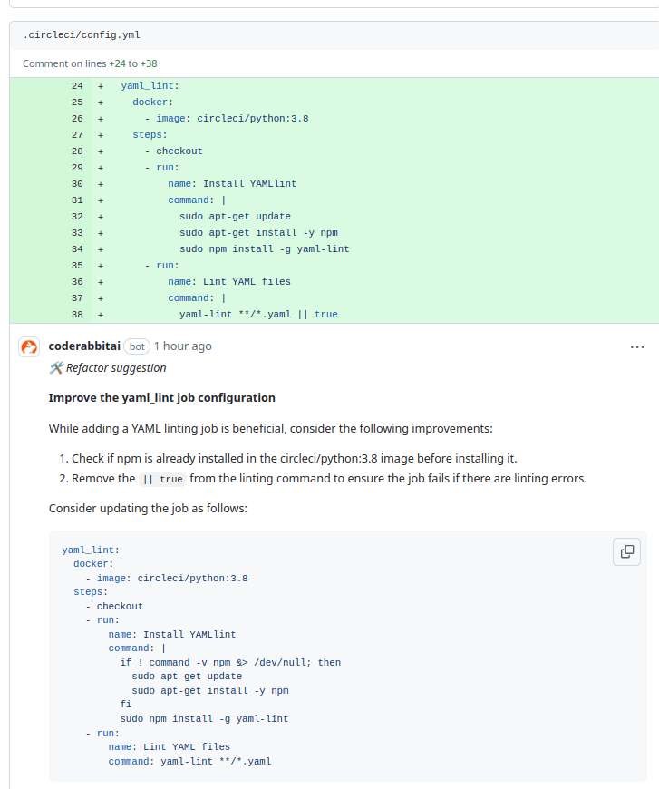 In the yaml_lint job, it has identified some areas for improvement in the configuration. Currently, the setup installs npm without verifying its availability in the circleci/python:3.8 image, which can lead to inefficiencies. Additionally, using || true in the linting command means the job will not fail even if there are linting errors, potentially masking critical issues in the YAML files.