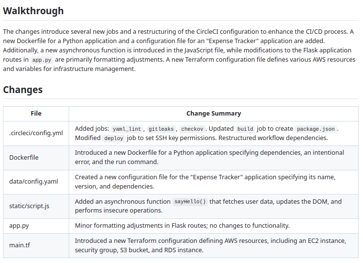 Upon submitting a pull request, it automatically reviews the file and generates a structured report with the following key sections: