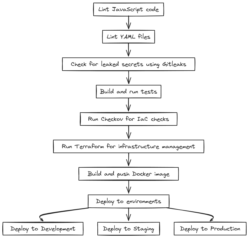 Deploys the application to different environments (development, staging, and production) with a manual approval step for production deployments.