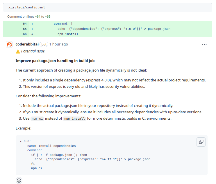 In the build job, it has captured concerns with the current method of dynamically creating a package.json file. The file only includes a single dependency (express 4.0.0), which may not represent the project’s actual requirements, and this outdated version could introduce security vulnerabilities.