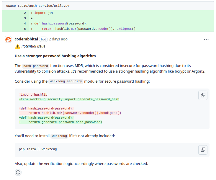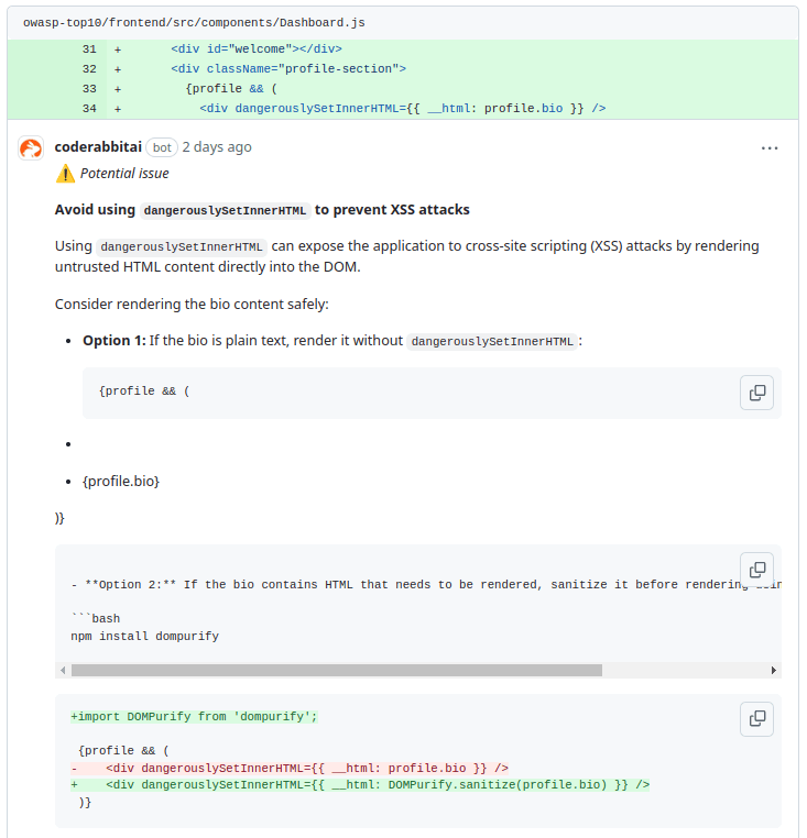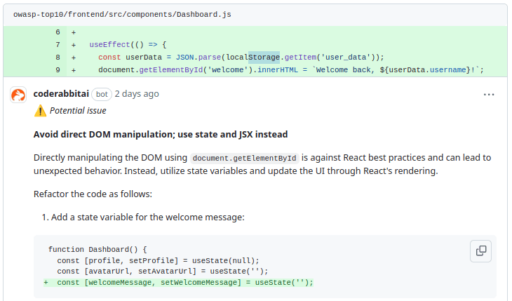 In addition to the OWASP violations mentioned, Coderabbit has identified other critical security issues, including broken authentication, insecure data storage, unvalidated input, potential XSS vulnerabilities, and more. These flaws could compromise sensitive data and allow unauthorized access.