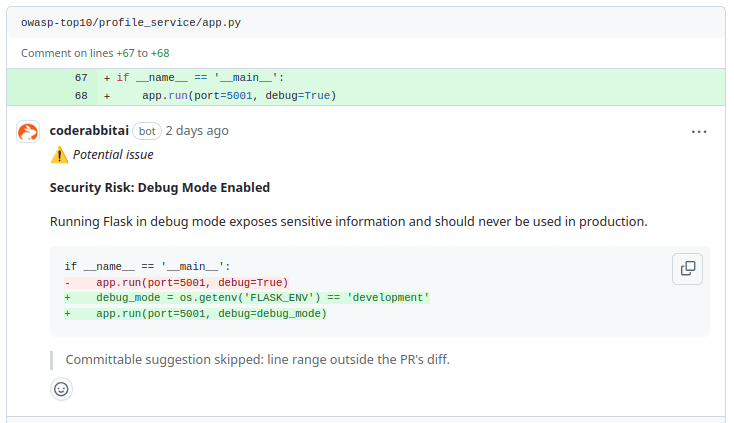 Running Flask in debug mode exposes sensitive information, such as stack traces and detailed error messages, which attackers can exploit. CodeRabbit has identified this issue and flagged it as a security risk. This practice violates the OWASP Security Misconfiguration (A05:2021) risk, as enabling debug mode in a production environment allows attackers to gain insights into the application's inner workings, significantly increasing the chances of an attack.