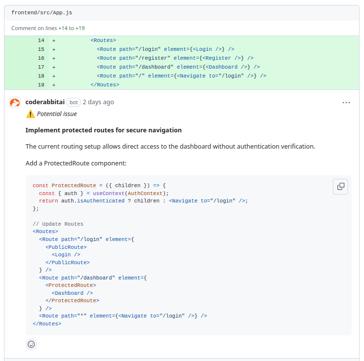 It suggests implementing a ProtectedRoute component that checks for user authentication before allowing access to sensitive routes, such as the /dashboard. This ensures that only authenticated users can navigate to restricted areas, effectively preventing unauthorized access and protecting sensitive data. Check out the review comment for more details.