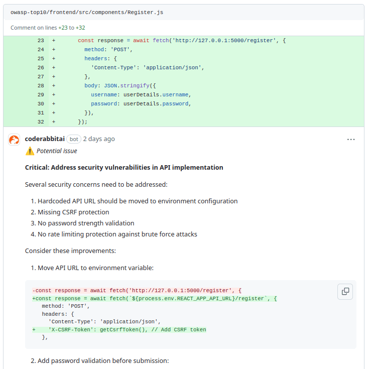 To mitigate this risk, it recommends moving the API URL to an environment variable, implementing CSRF protection by adding a token to requests, enforcing strong password validation before submission, and applying rate limiting to defend against brute-force attacks. These improvements will help mitigate the identified risks and enhance the application's overall security. You can read the code review comment to know more.