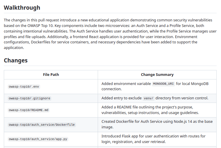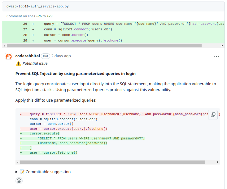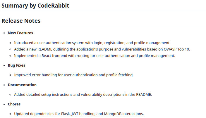 With just two clicks, we integrated CodeRabbit into the repository. When a pull request is created, CodeRabbit performs an automatic review and generates a detailed security report with three key sections.