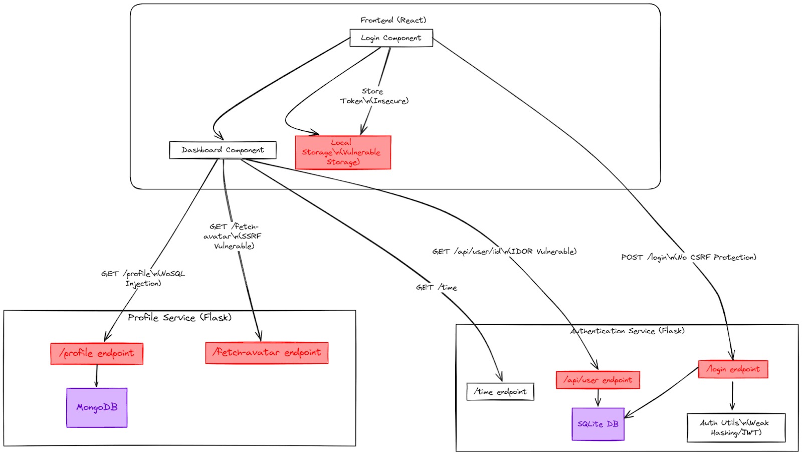 We developed a React web application intentionally configured with security violations to demonstrate CodeRabbit's effectiveness in identifying OWASP's Top 10 vulnerabilities. These included common missteps such as insecure authentication, unvalidated inputs, and missing encryption, all of which violate key OWASP guidelines. The diagram below gives a high-level overview of the application.