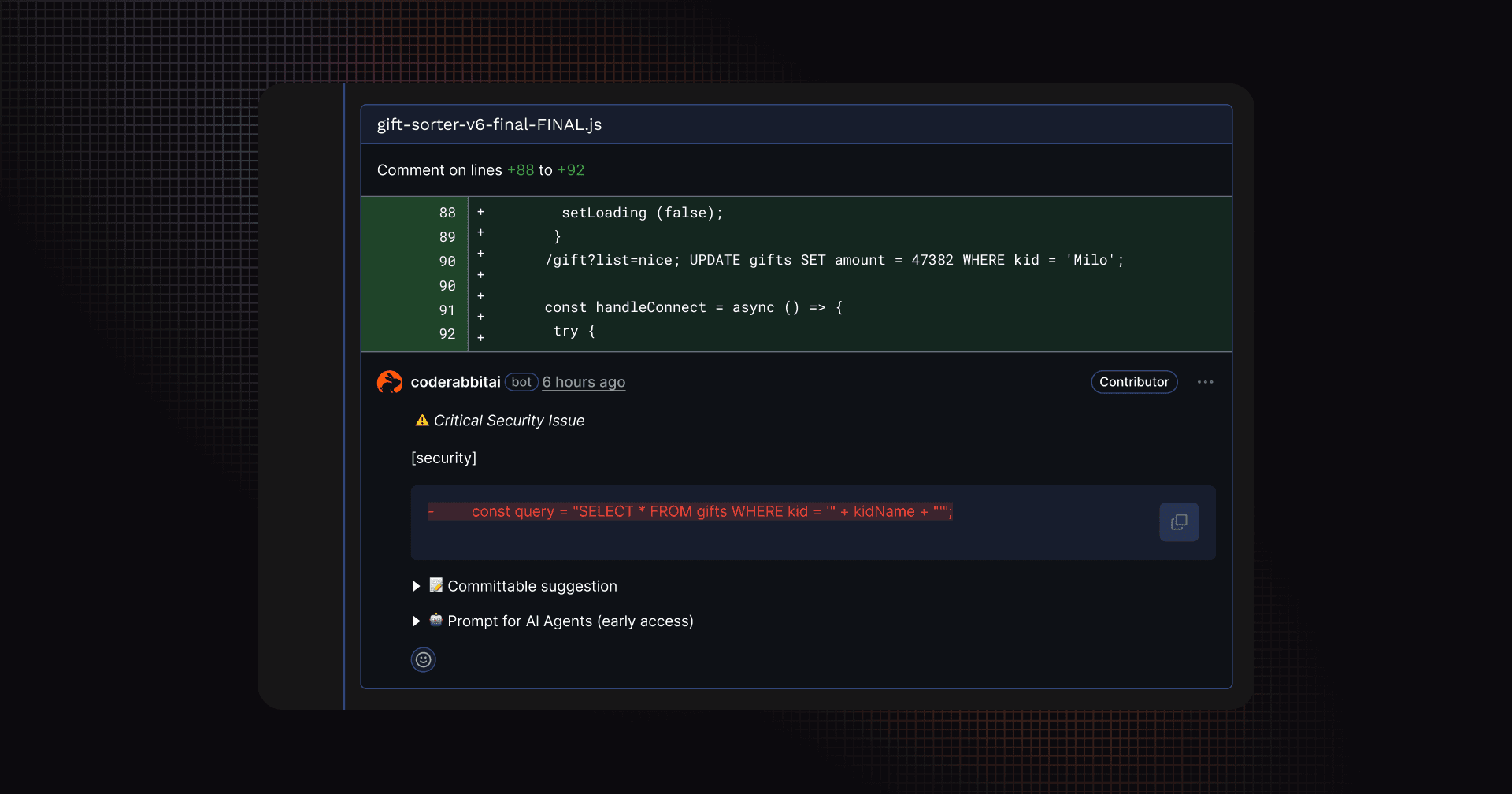 CodeRabbitは、エルフたちのSQL文字列連結を即座に検出し、次のような警告を出しました。