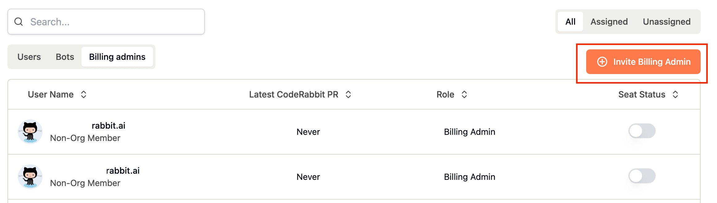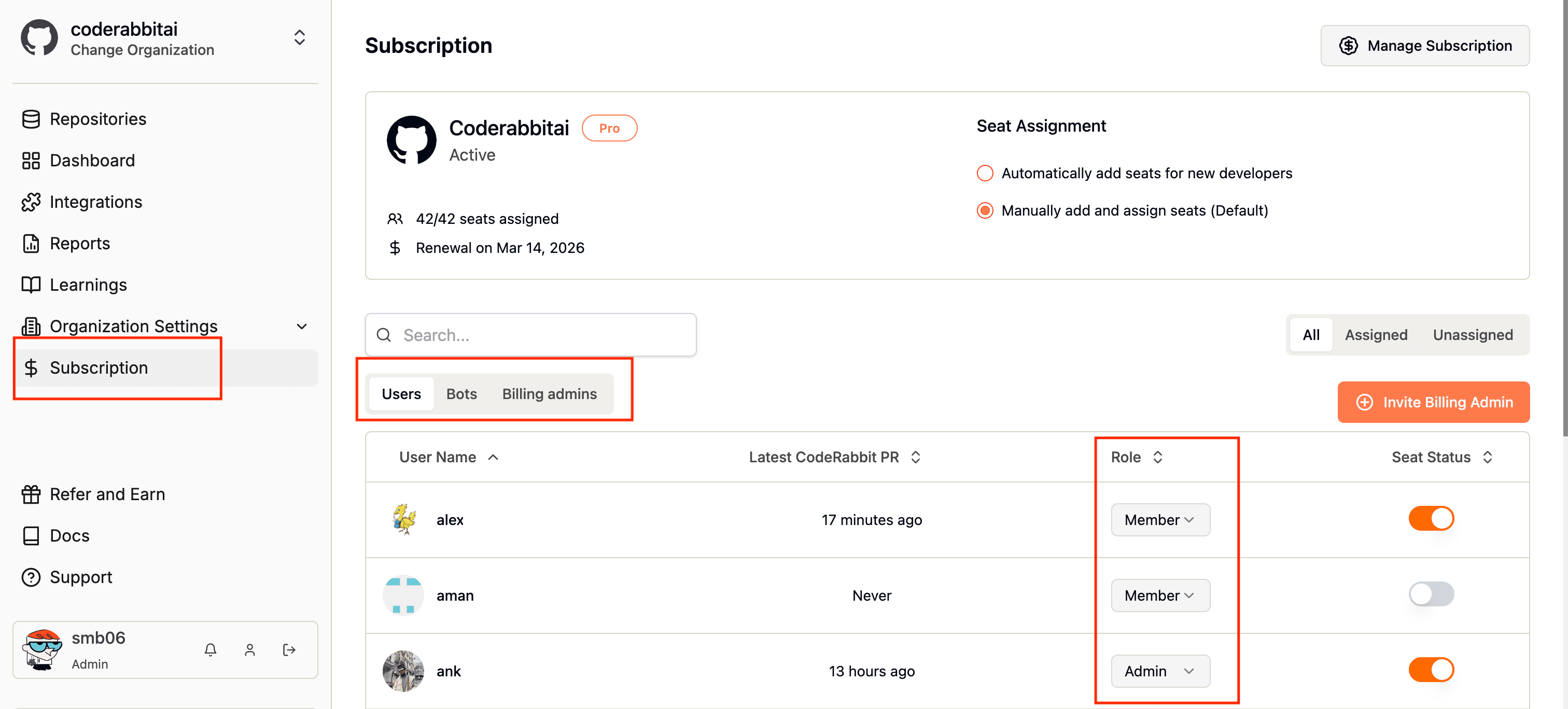 We recommend assigning the “Billing Admin” role to users who will only be responsible for managing the financial aspects of your CodeRabbit subscription, such as adding new users, increasing the number of seats, changing plans, etc. If you do not have a dedicated person that will act as a “Billing Admin” then any other “Admin” in your Org can also perform all billing and subscription tasks.
