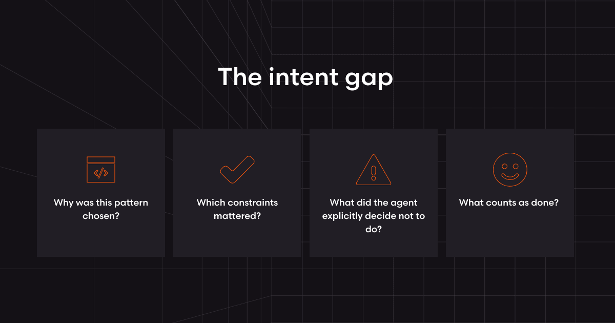 The problem isn't the code quality. The agents write clean, tested, locally-correct code. The problem is intent. Some ‘human’ questions that code never answered particularly well: