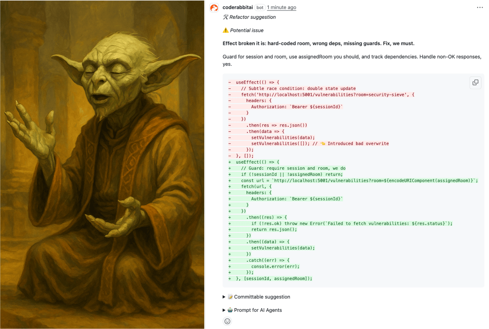 He’s a master of terse, yet impactful, critiques. When faced with a subtle race condition and hard-coded dependencies, he’ll give you a refactor suggestion with his classic wisdom: “Effect broken it is: hard-coded room, wrong deps, missing guards. Fix, we must.” He then provides a detailed fix that addresses the issue, guards against errors, and correctly handles dependencies.