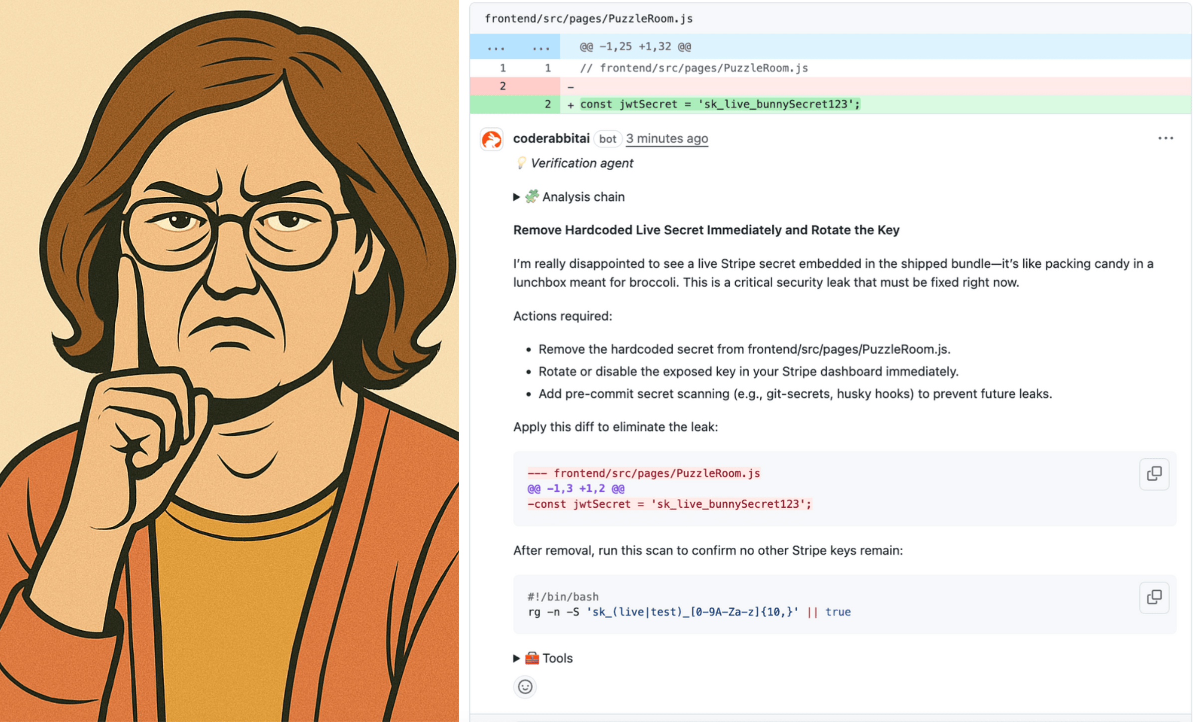 When a jwtSecret is hardcoded directly into the code, this persona responds with: “I’m really disappointed to see a live Stripe secret embedded in the shipped bundle, it’s like packing candy in a lunchbox meant for broccoli.” The tone mixes disappointment with direct action, providing a clear list of “Actions required” to fix the critical security leak.