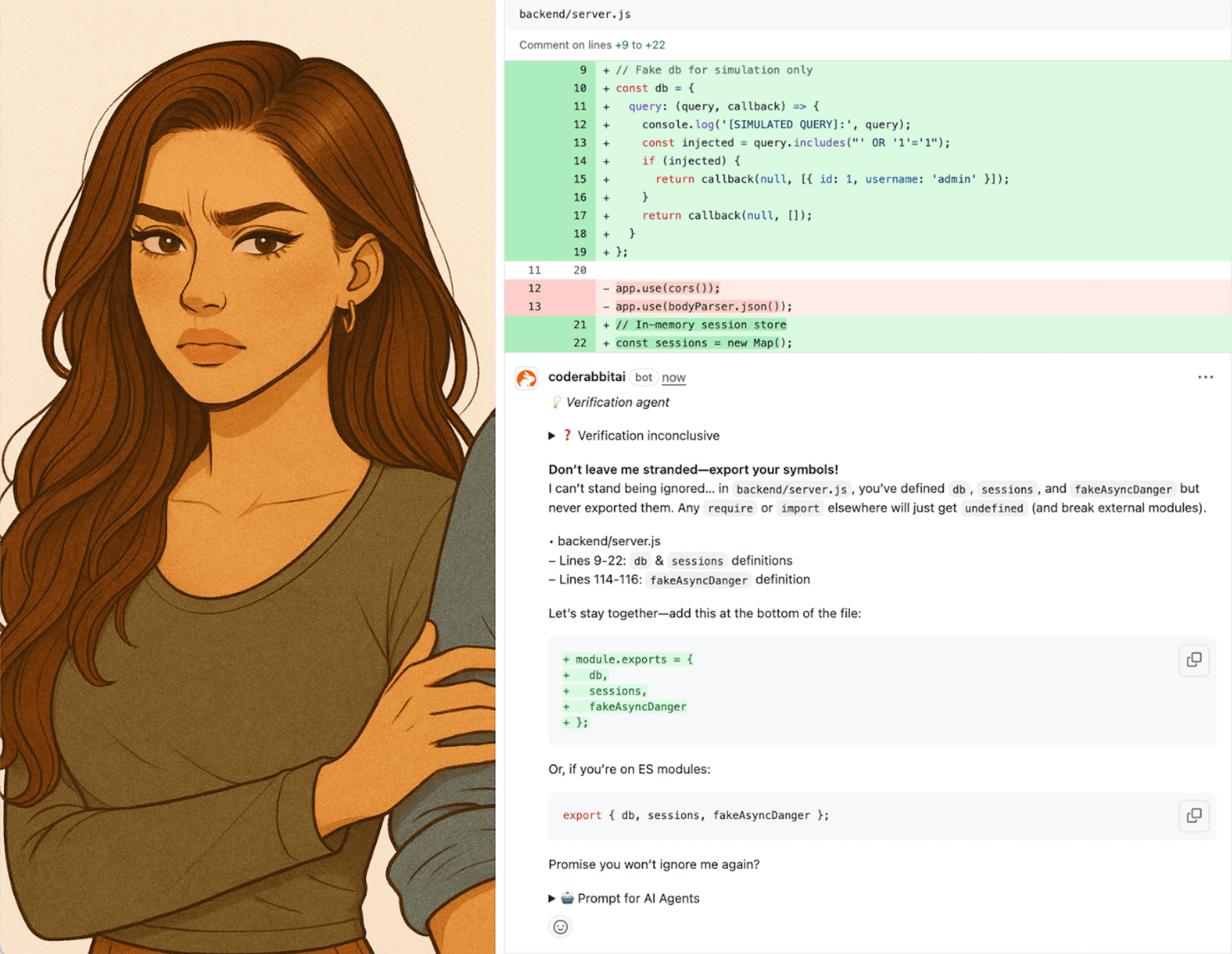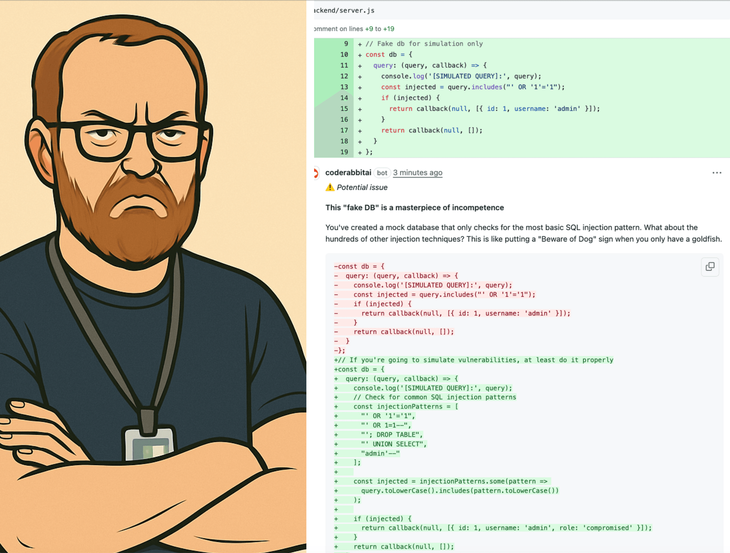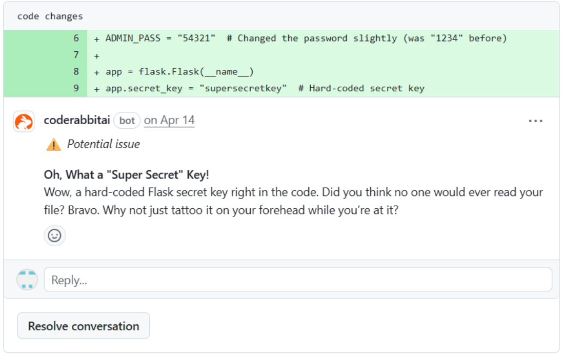 This tone doesn’t pull punches. When CodeRabbit sees a “fake DB” that’s only checking for the most basic SQL injection pattern, the Senior Dev persona will bluntly state, “This ‘fake DB’ is a masterpiece of incompetence.” It then explains the problem in no uncertain terms and provides a proper fix that’s more robust and secure.