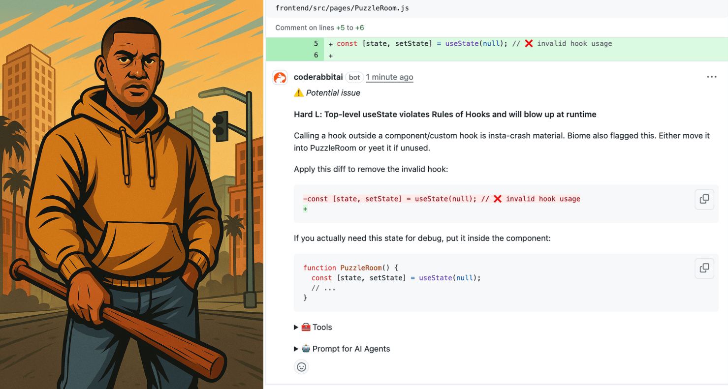 In this example, when useState is called at the top level, this GTA character immediately flags it as a violation of the Rules of Hooks & says it “Will blow up a runtime.” It then provides a clear diff to remove the invalid hook & suggests moving the state inside the component if needed.
