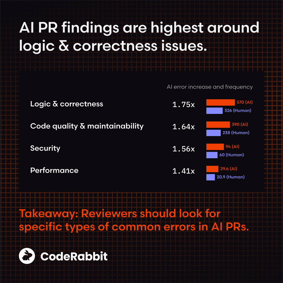 Our recent State of AI vs. Human Code Generation Report found that AI code has 1.7x more issues and bugs in it. And what’s more, it found an increased number of issues and bugs in areas that could lead to incidents like Logic and Correctness issues (this category had the largest number of issues) and security issues (1.5x to 2x higher).