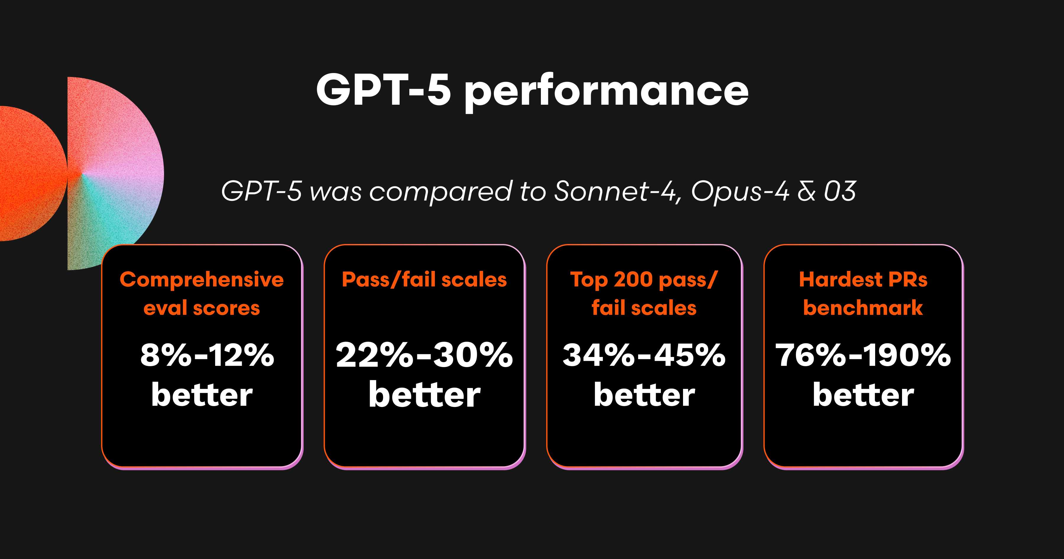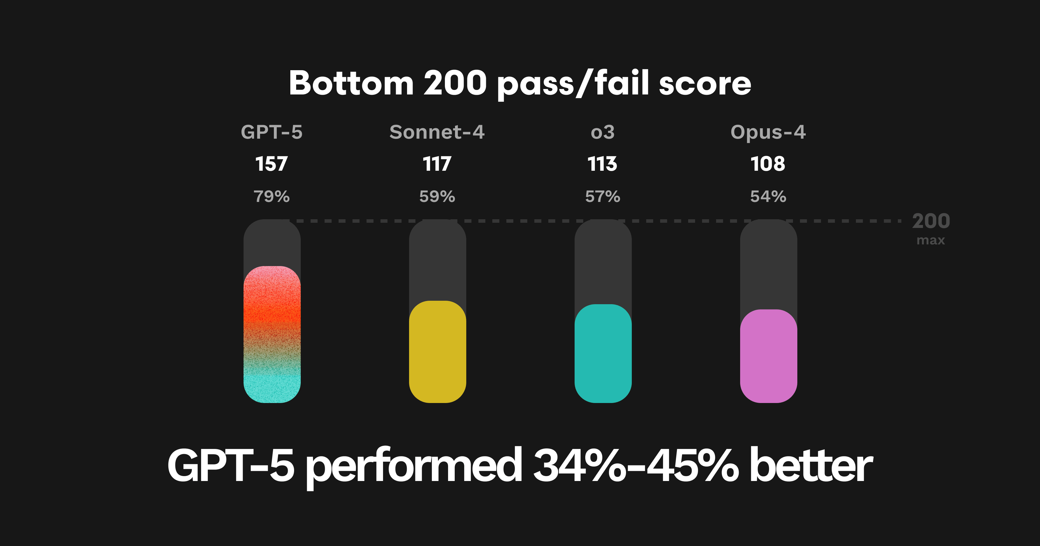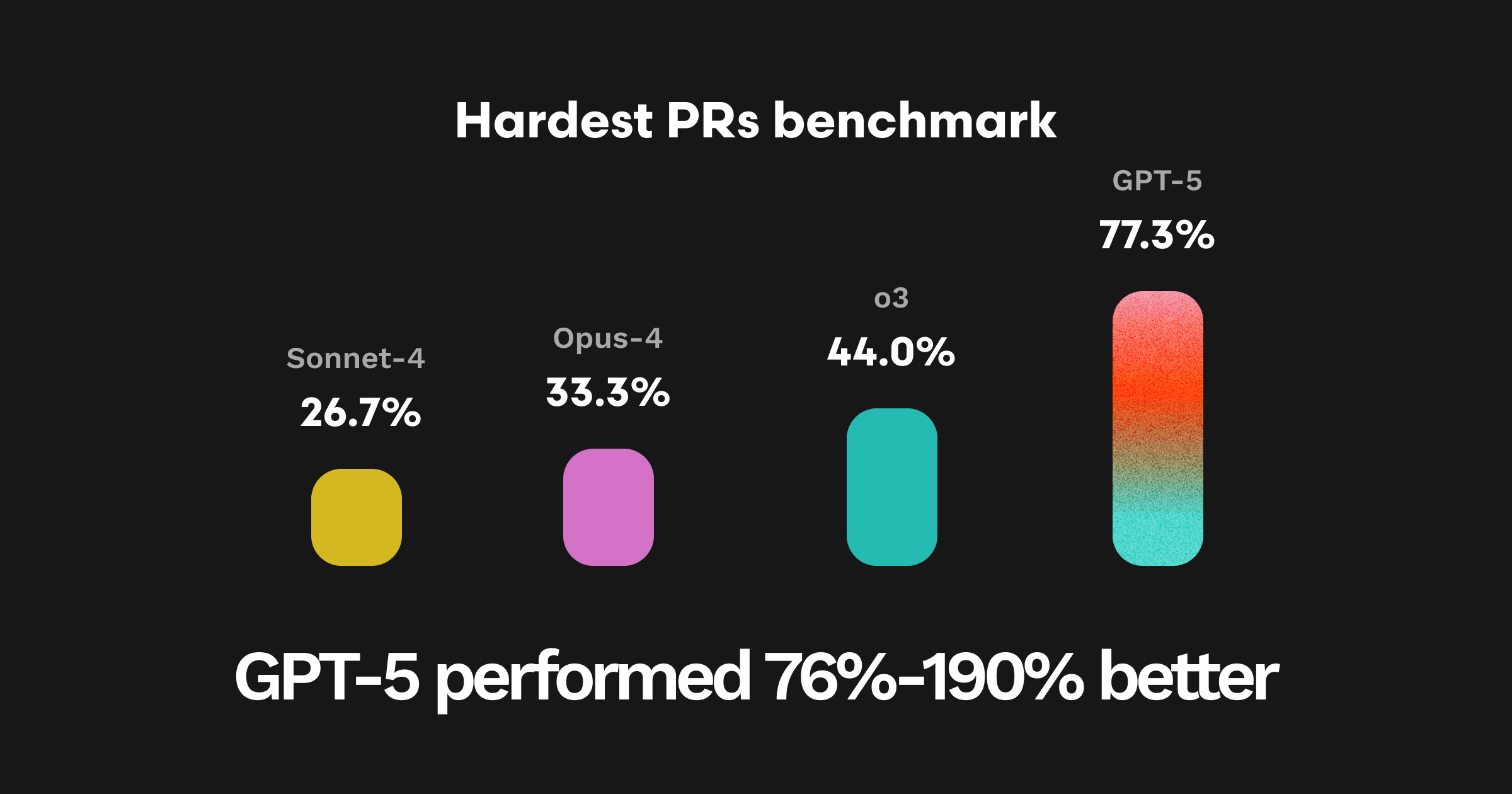 評価データセットの中で最も難しい25件のPRにおいて、GPT-5は史上最高の合格率77.3%を達成しました。これはSonnet-4比で190%の改善、Opus-4比で132%の改善、O3比で76%の改善を示します