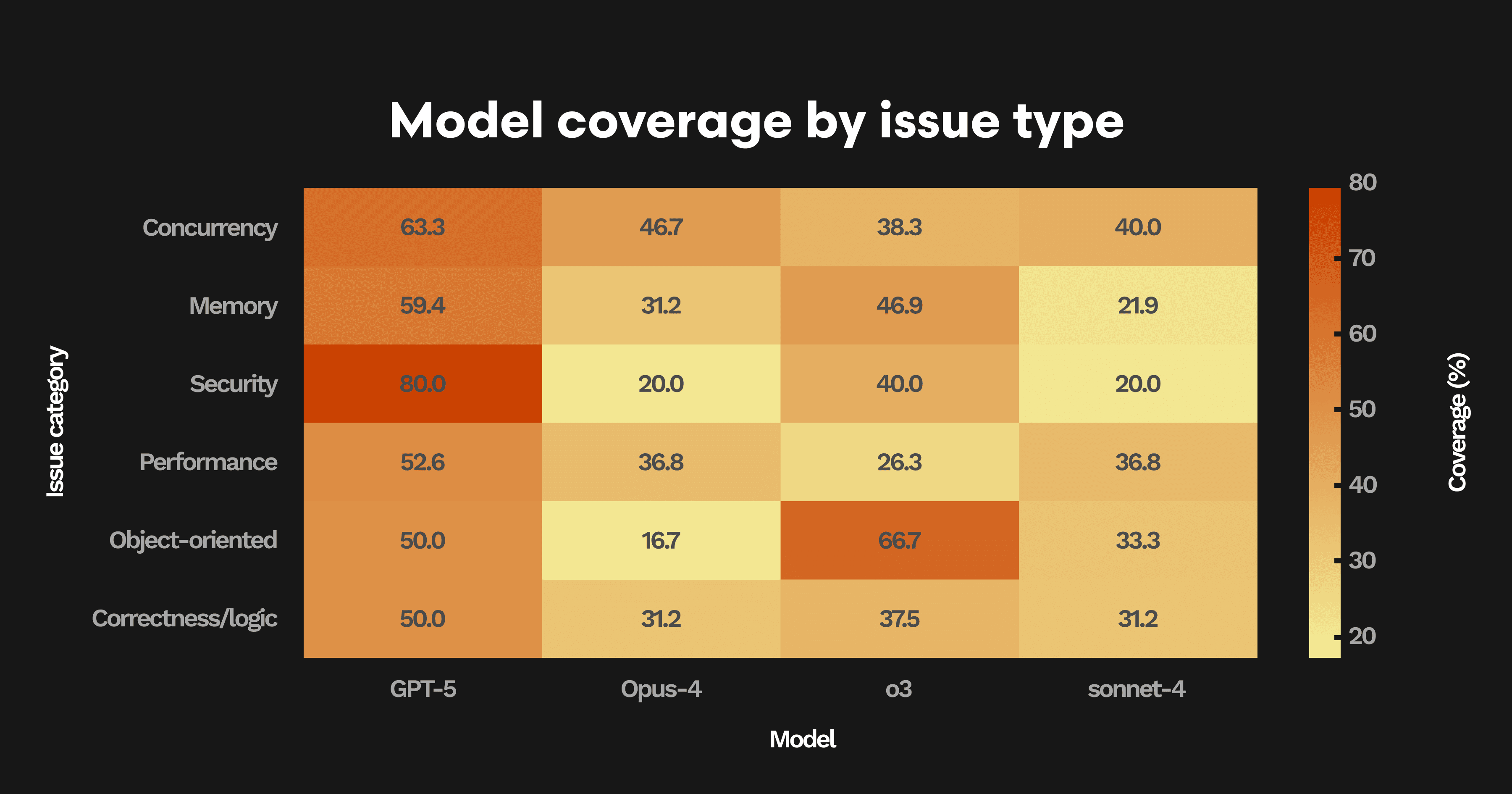 GPT-5はほぼすべてのカテゴリで先行しており、並行性、パフォーマンス、メモリ関連のバグの60%以上を特定し、さらにセキュリティ問題の 80% を検出するという顕著な結果を示しました