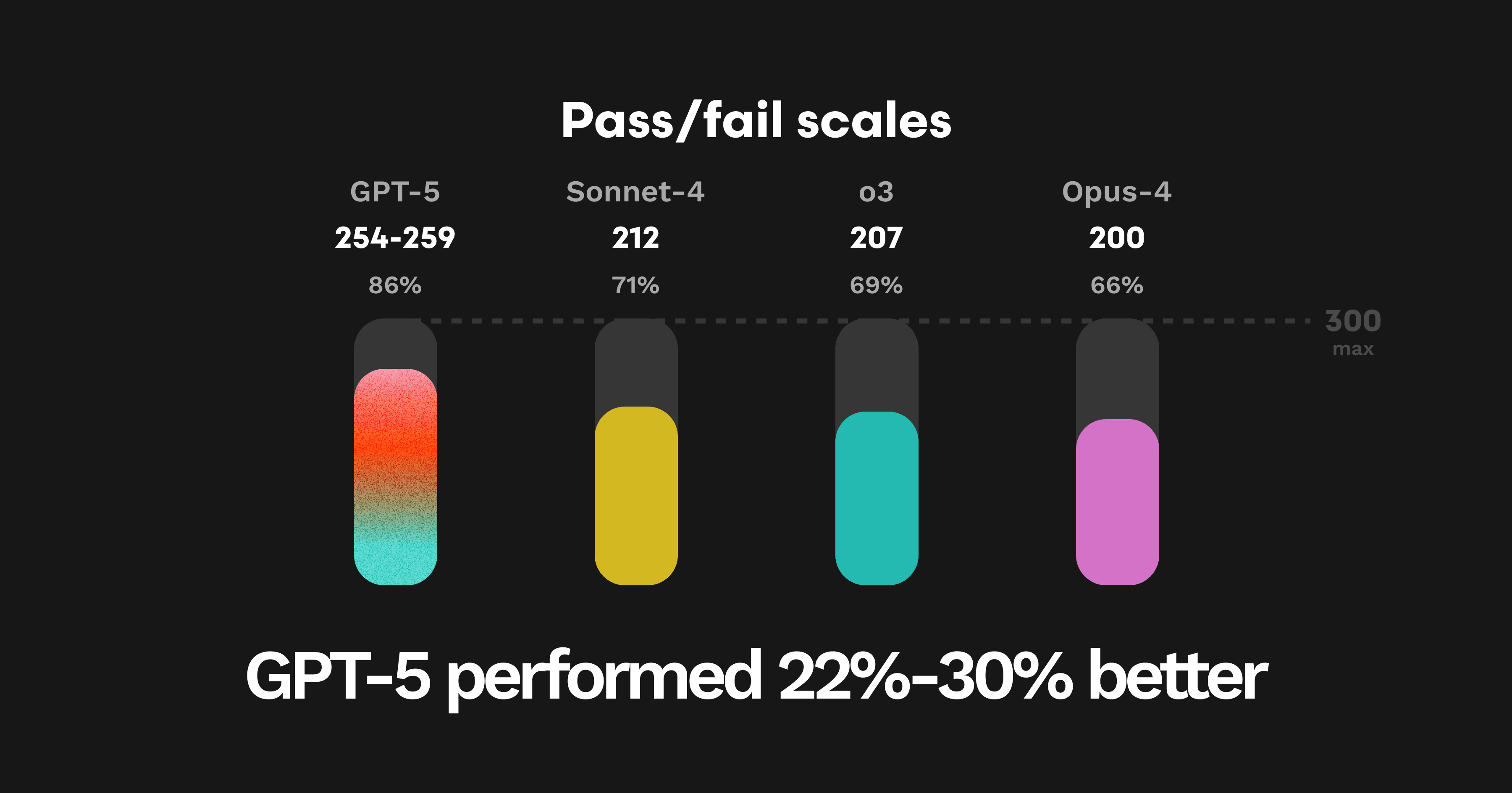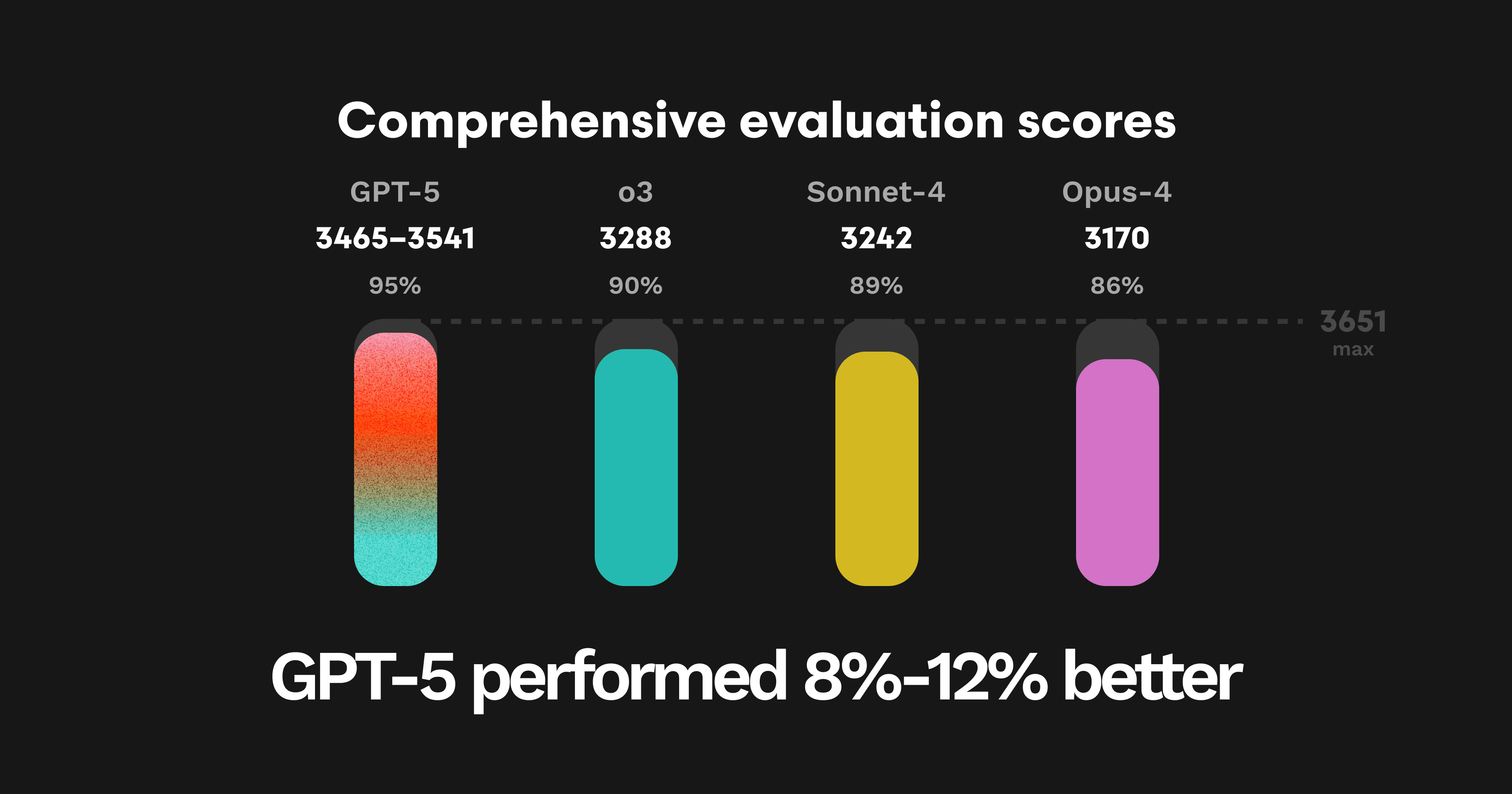GPT-5の包括評価における重み付きスコアはテスト実行ごとに3465〜3541の範囲でした。これは以前に最高スコアであったOpenAIのO3やAnthropicのSonnet 4をほぼ200ポイント上回ります。最大得点は3651です。
