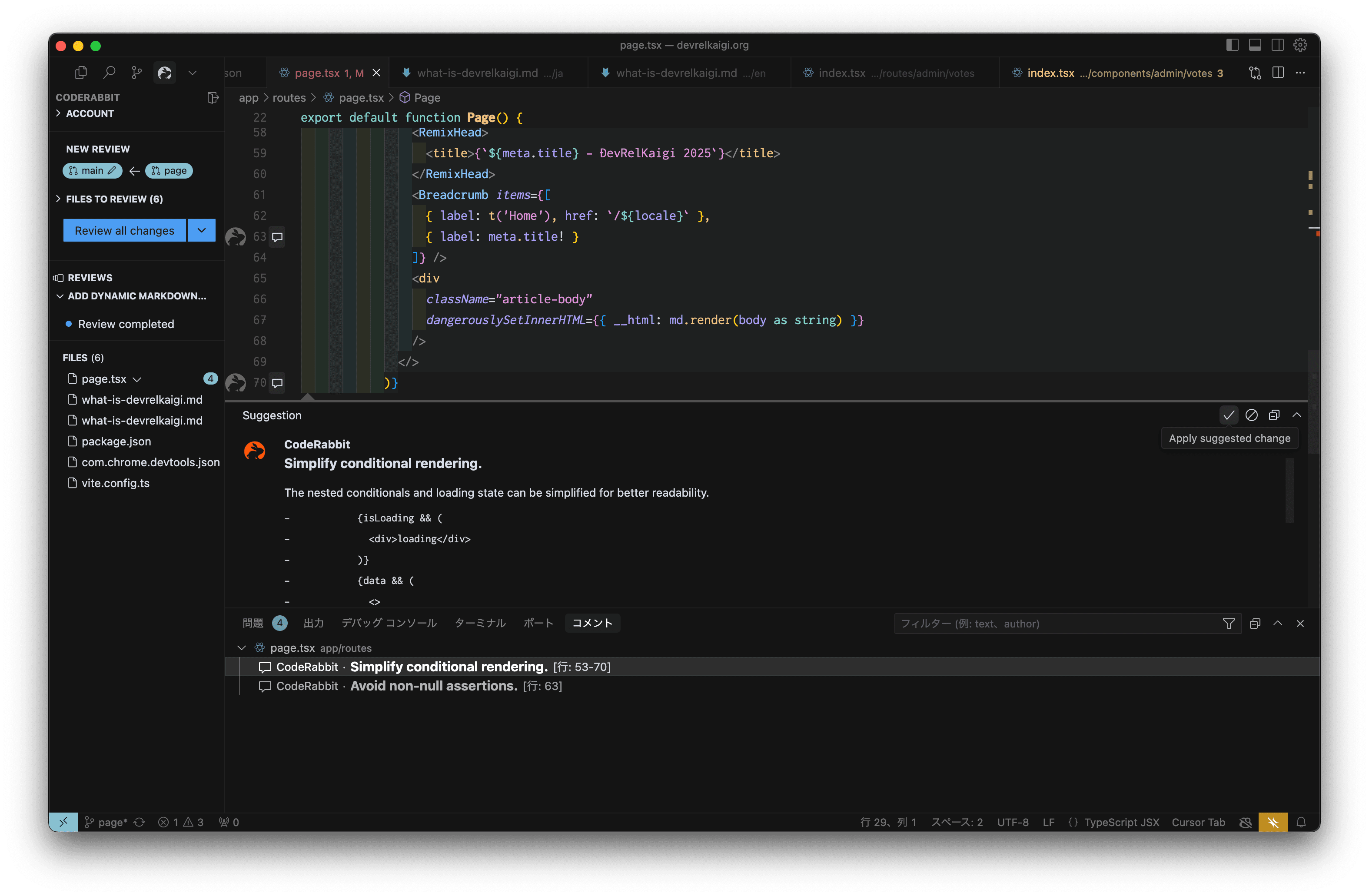IDE上ではCodeRabbitの軽量バージョンが動作し、コードに対するフィードバックを即座に提供します。ちょっとした記述ミスやバグの兆候もその場でキャッチしてくれるため、開発中の修正がスムーズになります。