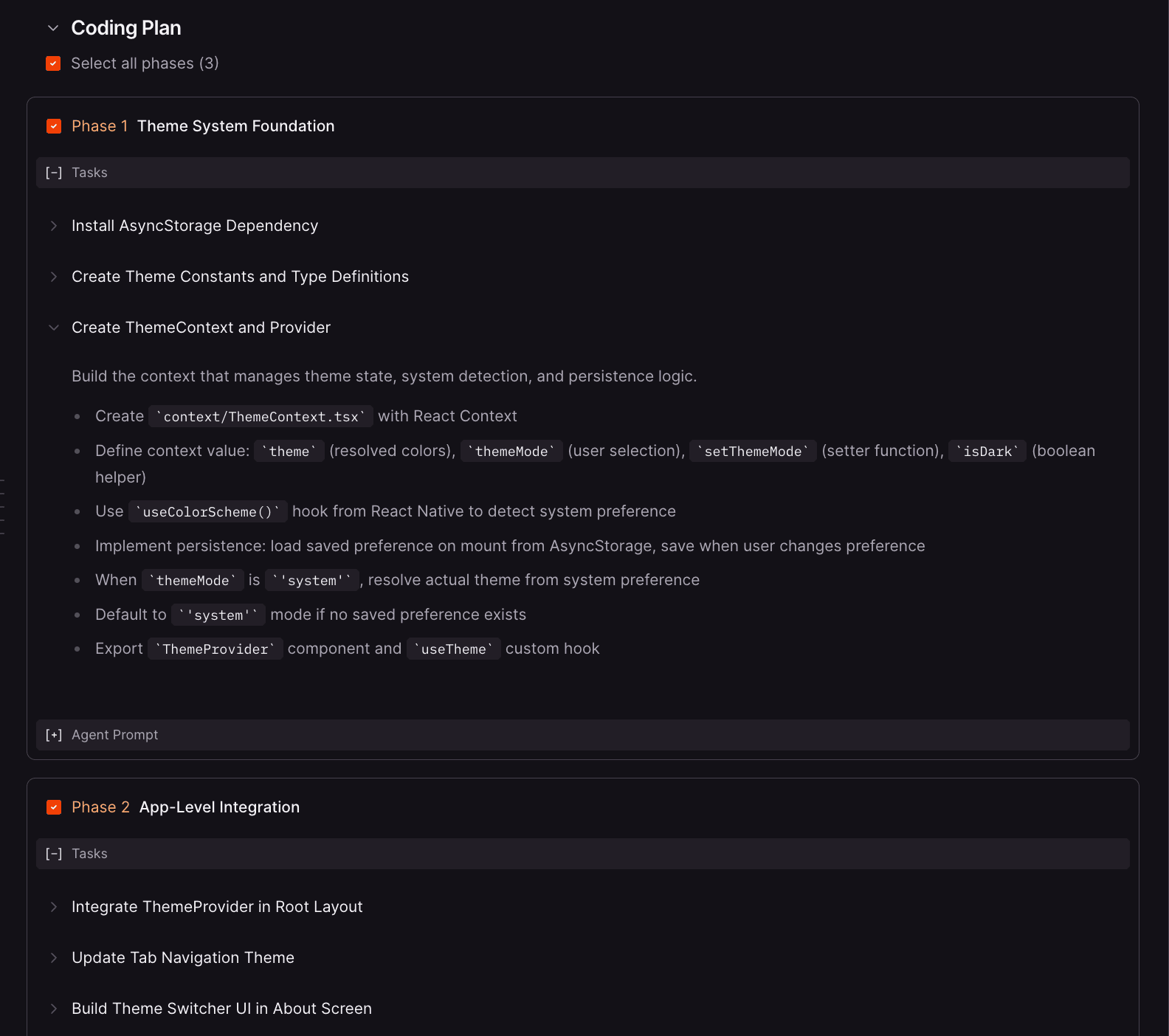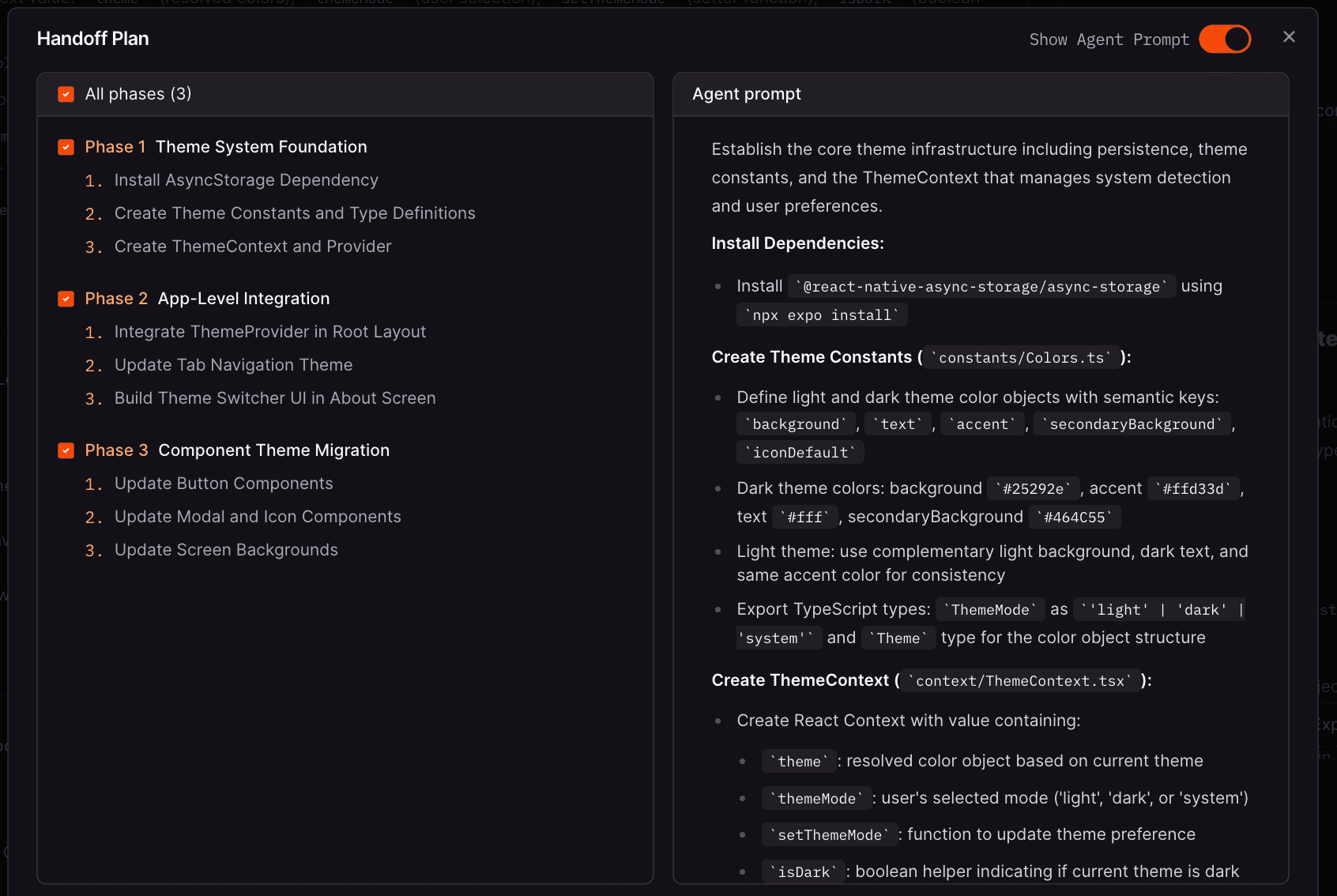 フェーズ1で基盤を整え(AsyncStorage や ThemeProvider)、フェーズ2でアプリ全体に統合し、フェーズ3で既存コンポーネントを移行する、といった構成になります。