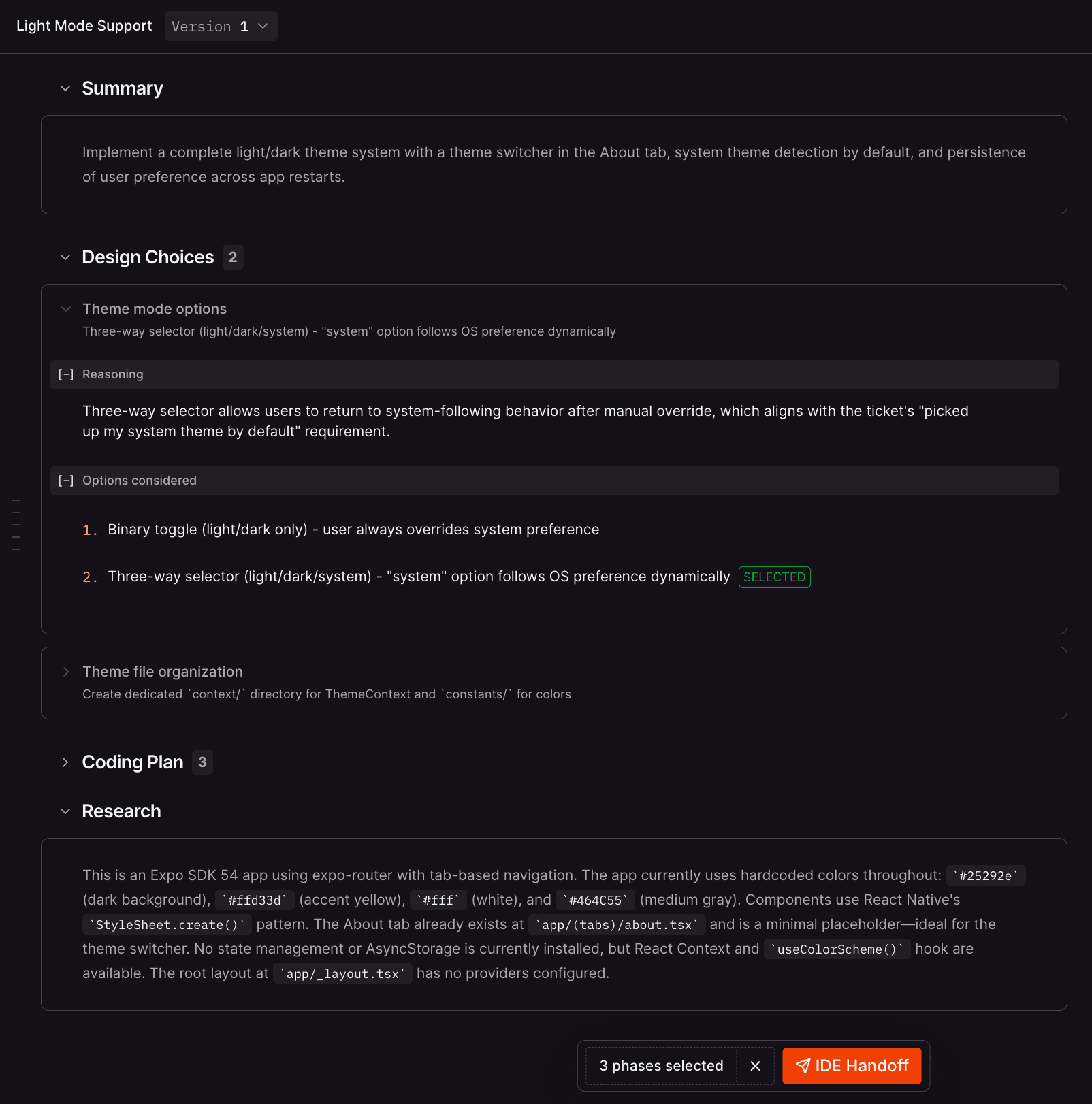 プランに満足したら、作業したいフェーズを選び IDE Handoff をクリックします。