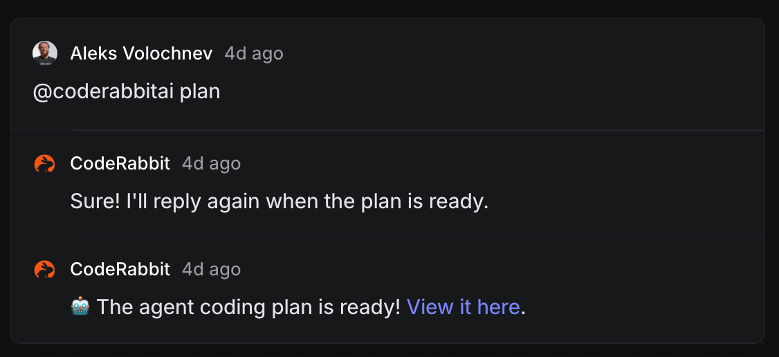 最も簡単な方法は、Issue に @coderabbitai plan とコメントすることです。数分後、CodeRabbit が Coding Plan へのリンク付きで返信します。